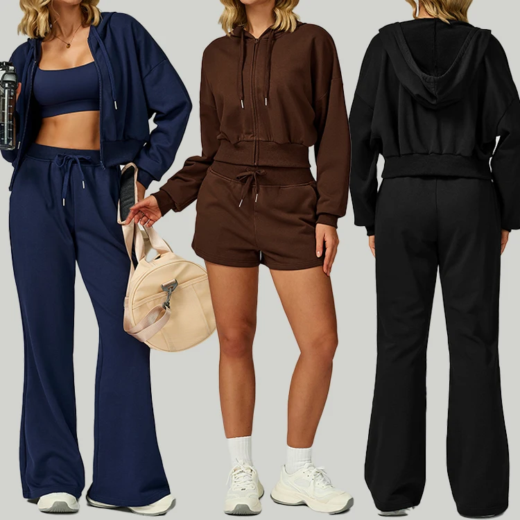 High Quality Sport Outfit Zipper Cropped Sweatshirt Top and Wide Leg Pants Set Women Lounge Wear Vintage Lady Tracksuits