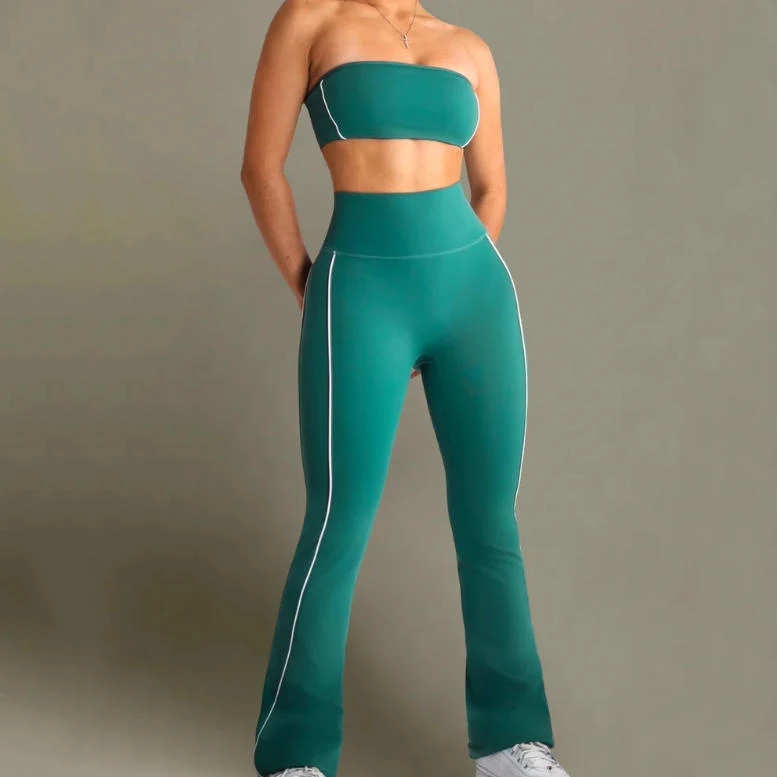 Wholesale Splicing Lines Custom logo Sports Breathable No Shoulder Straps Yoga Bra Gym Flared Wide-leg Leggings Sets Woman