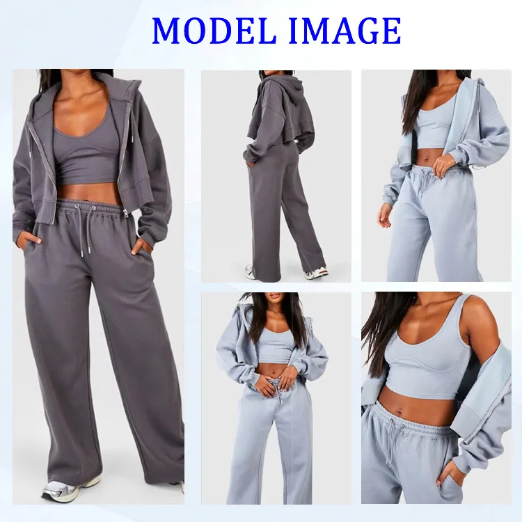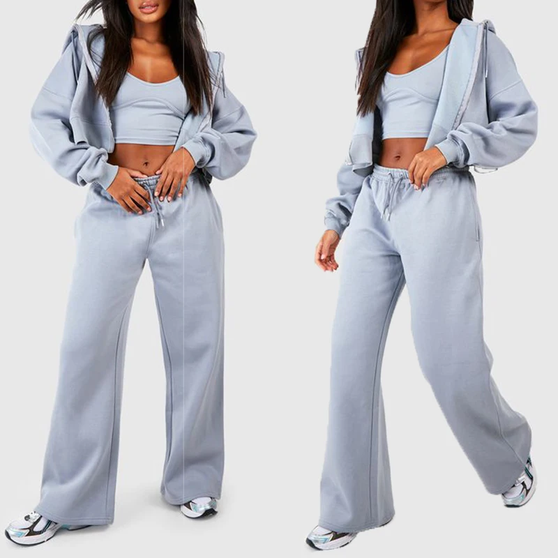 Custom Womens Activewear Casual Loose Two Piece Jackets Tracksuits Crop Zipper Hoodie Wide Leg Pants Sports Hoodies Set