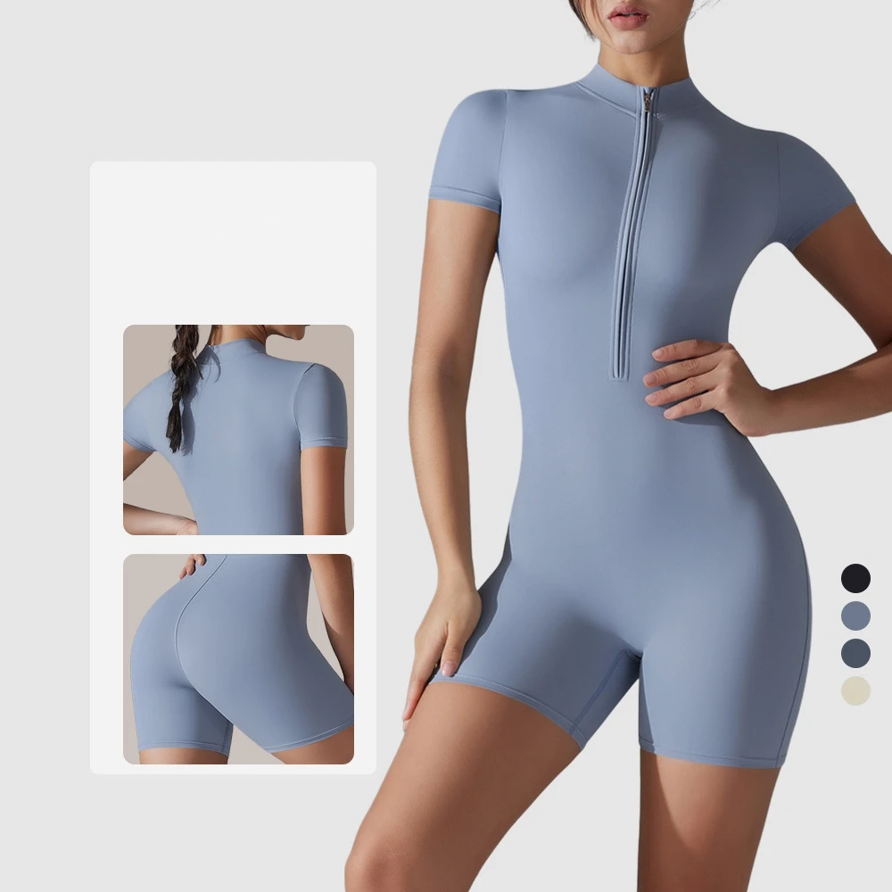 Women's High Elasticity Half Zipper Dance Fitness Sports Jumpsuit New Solid Color Tight Short Jumpsuit
