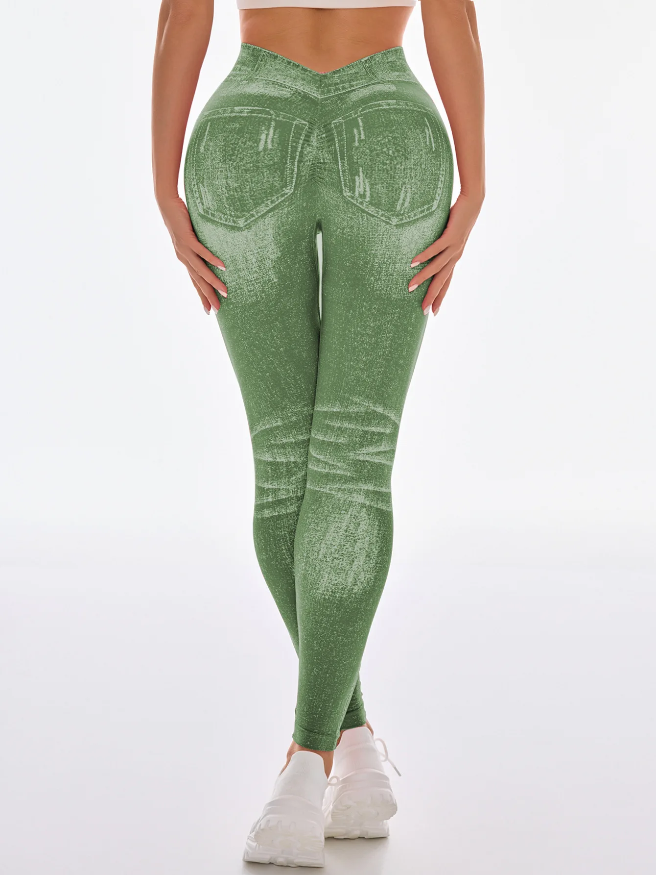Women's High Waist Seamless Yoga Pants Denim V-Back Hip Lifting Quick Drying Tight Fit Running Fitness Yoga Leggings