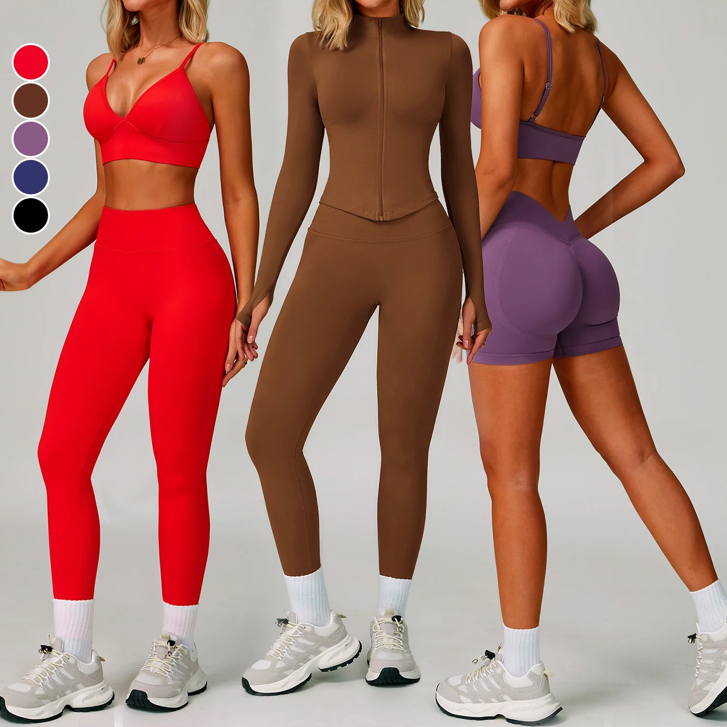 YISHENHON Women's Fitness Activewear Set 5pcs Seamless Yoga Leggings & Bras with Long Sleeve Gym Tops Solid Pattern Sport Outfit