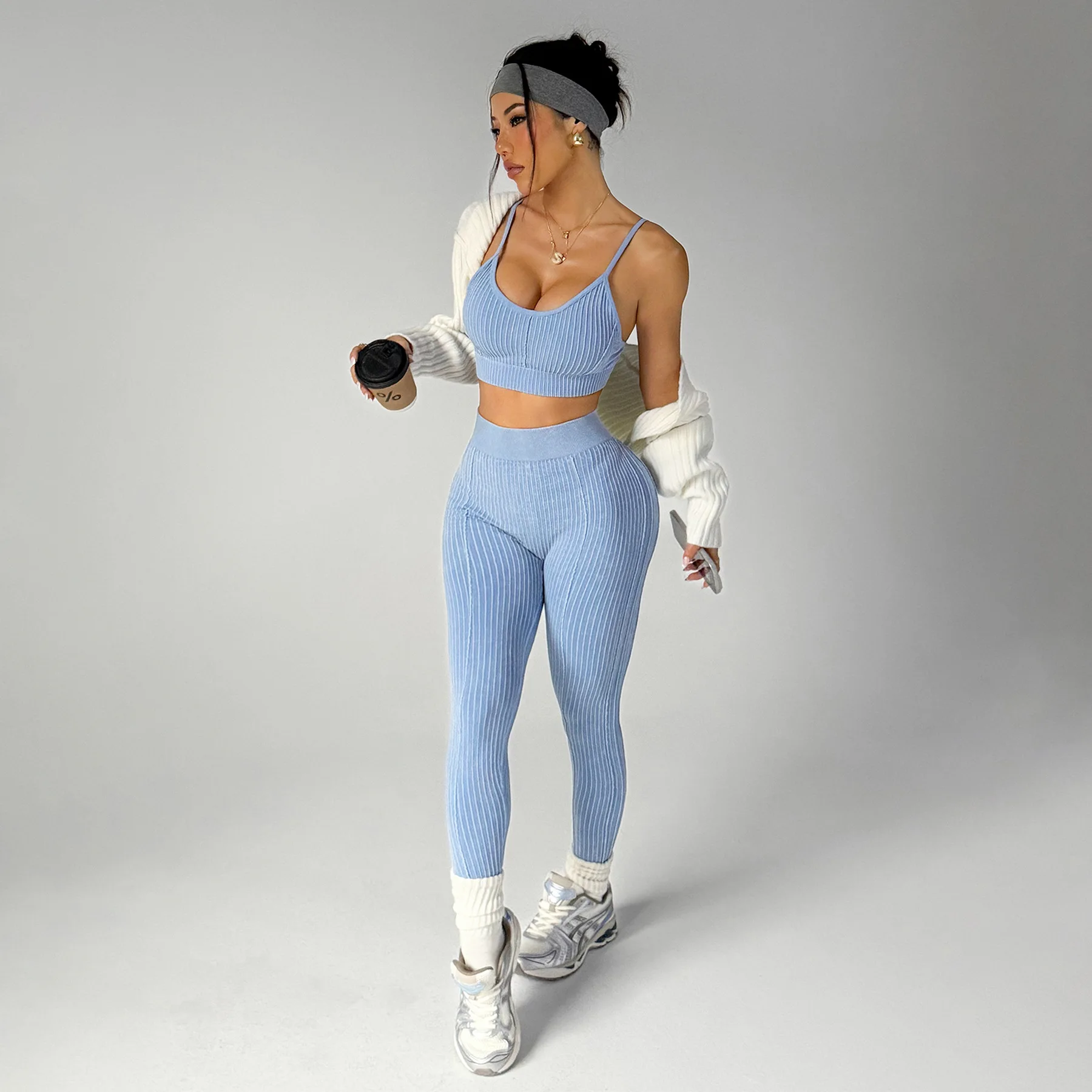 European American Style Women's Sports Fitness Running Two-Piece Set Sand Wash Peach Hip Seamless Yoga Pants Shockproof Solid