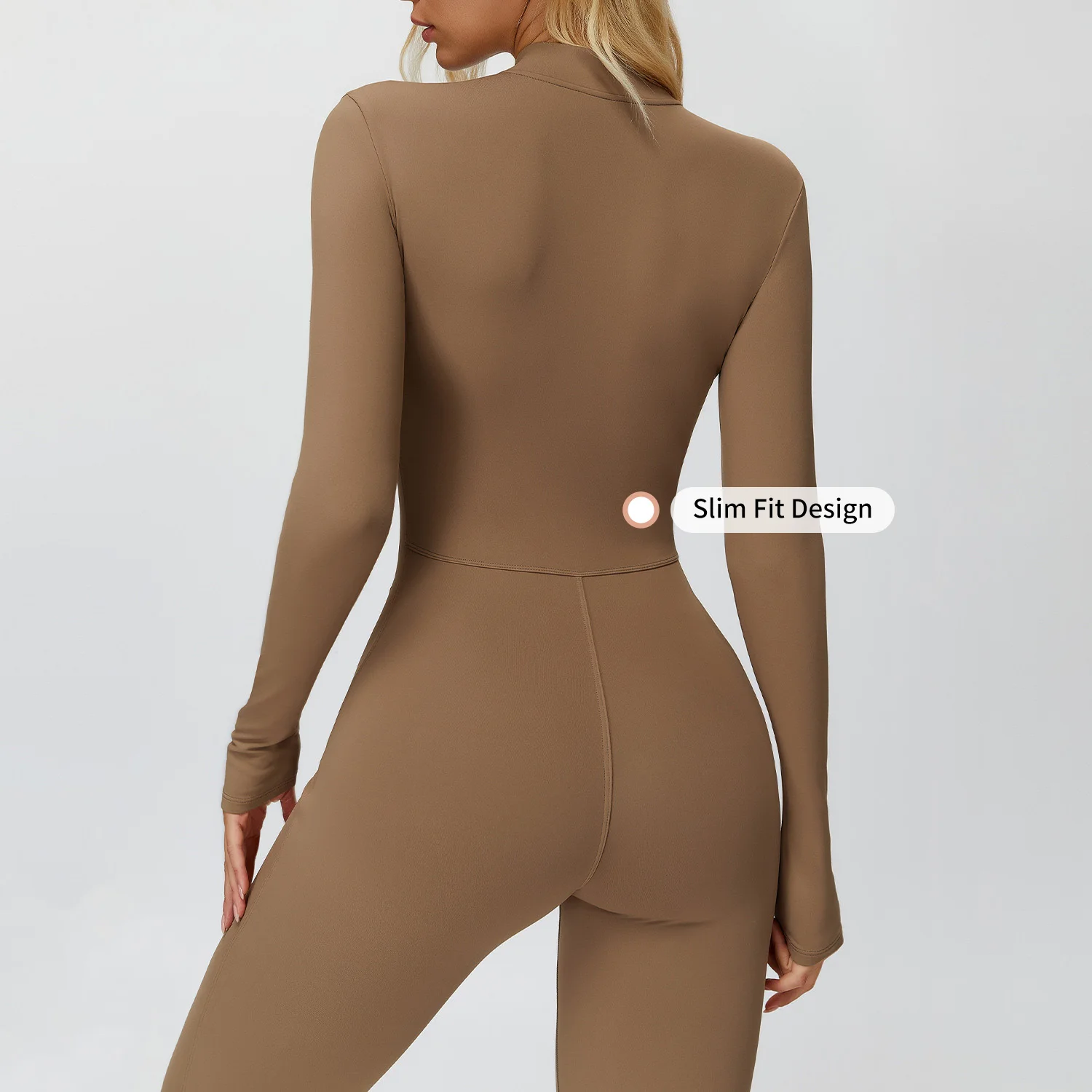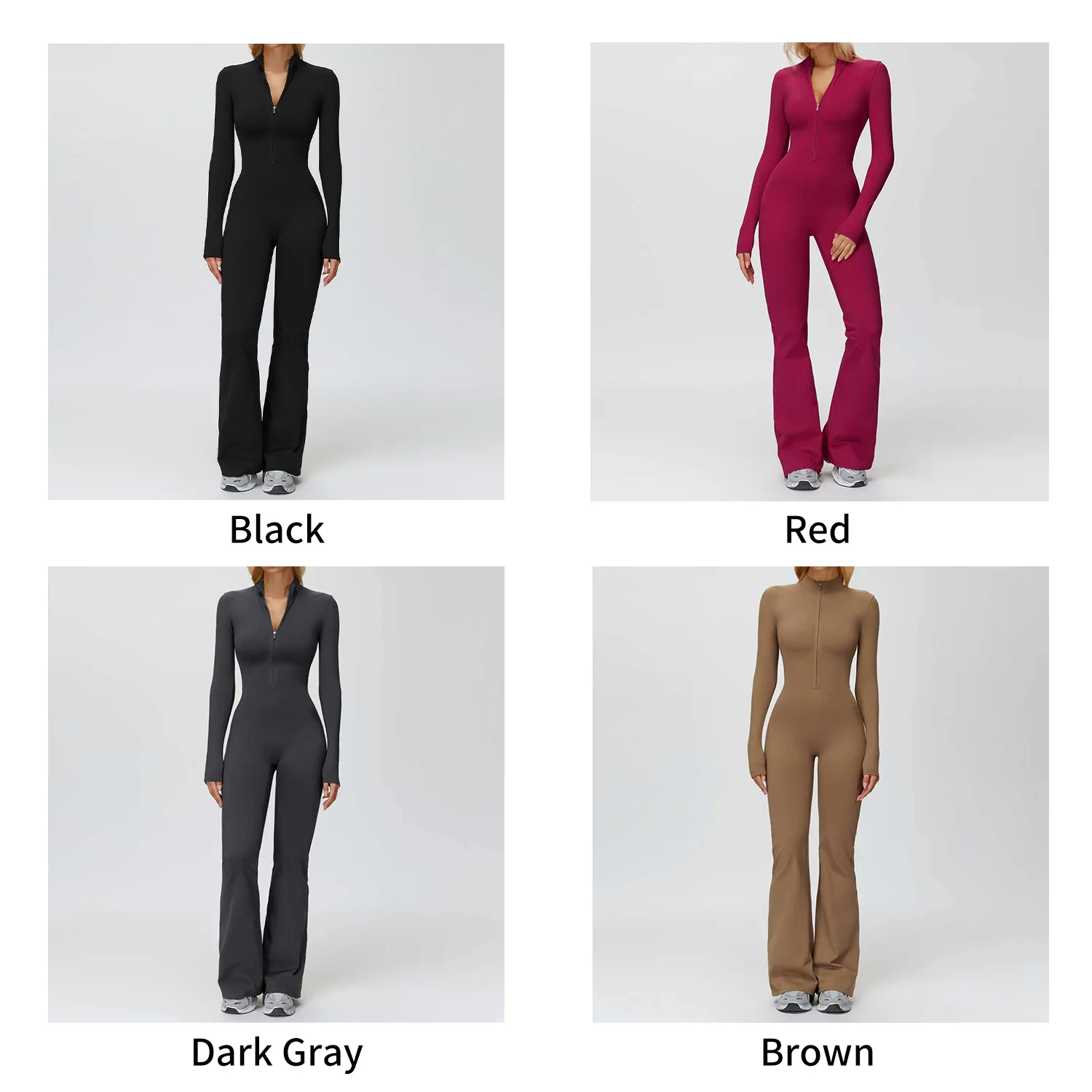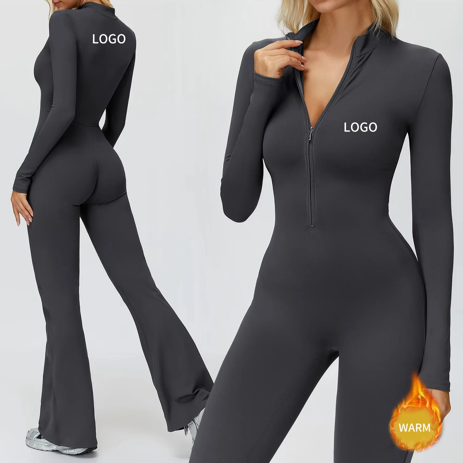 Fall Winter New Women's Long Sleeve Yoga Jumpsuit Slim-Fit Custom Logo Keep Warm Half Zip Wide Leg Sports Fitness Bodysuit