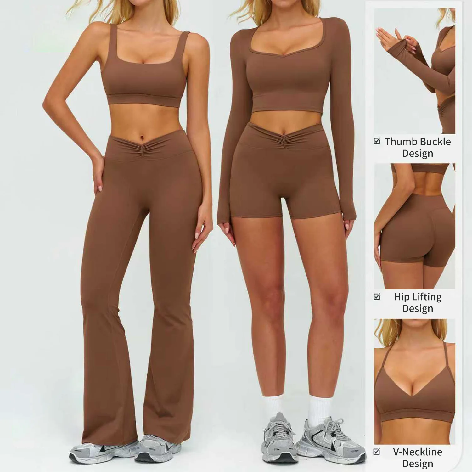 YISHENHON Women's Fitness Activewear Set 5pcs Seamless Yoga Leggings & Bras with Long Sleeve Gym Tops Solid Pattern Sport Outfit