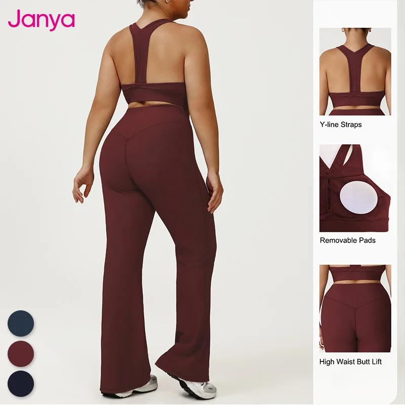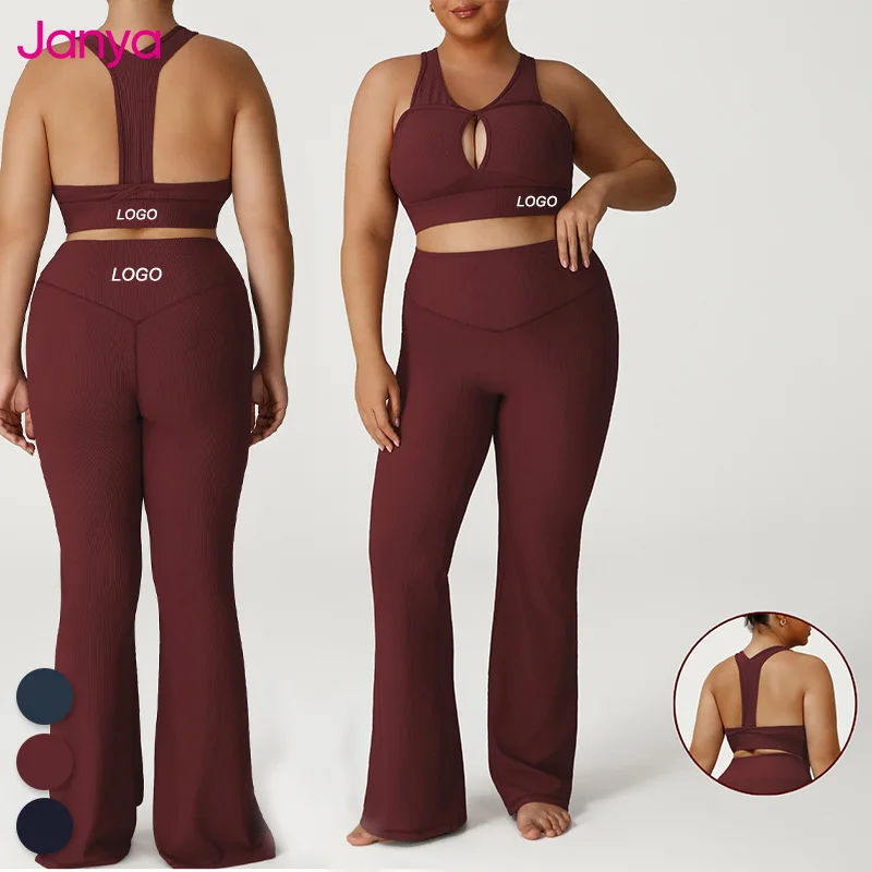 Janya Fashion Plus Size Y-line Straps Cut-out Sport Bra and Leggings Set Breathable Elastic Waist Four-Way Stretch 2 Piece Set