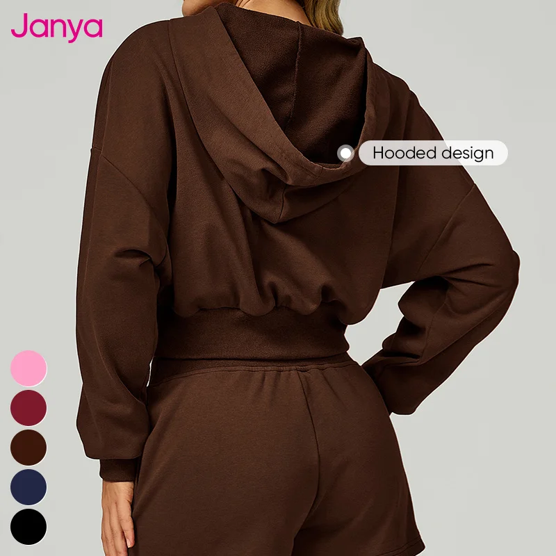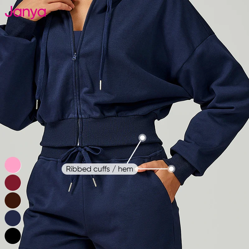 Janya Women's Loose Casual Crop Hoodie Ribbed Hem Full Zipper Custom Logo Breathable Sports Jacket Autumn Long Sleeve Sweatshirt