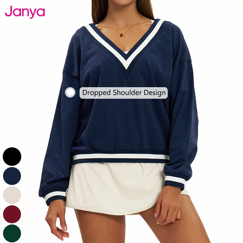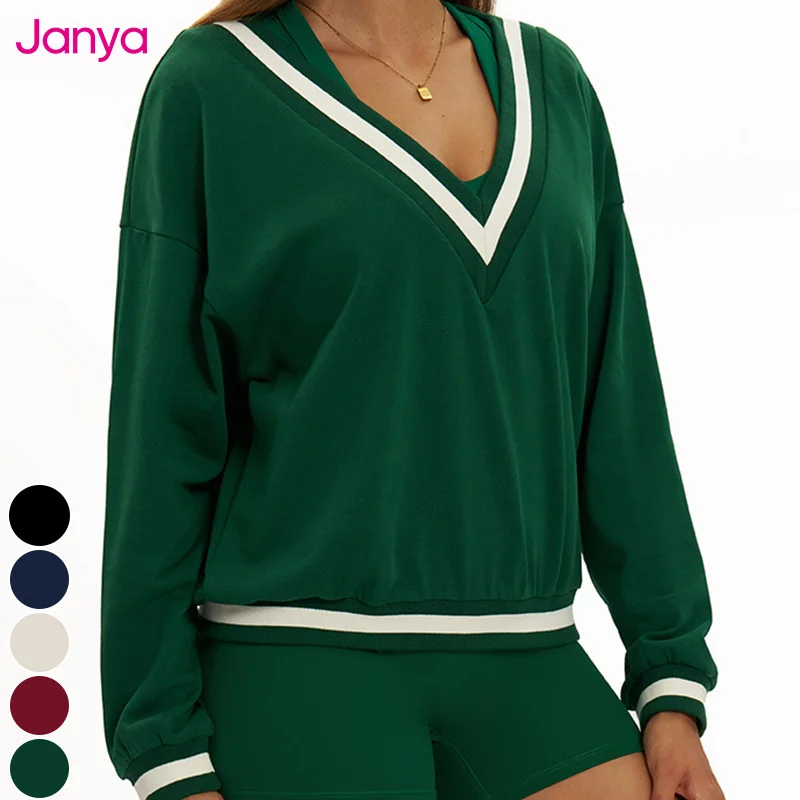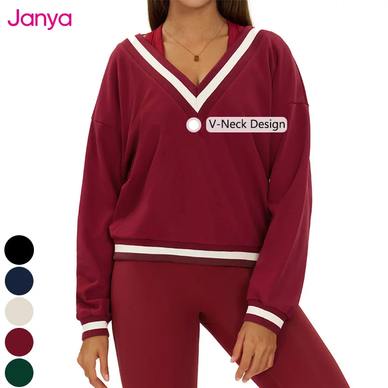 Janya Autumn Winter V-Neck Sports Yoga Top for Women Loose Casual Color Block Long Sleeve Gym for Running and Fitness Sweatshirt