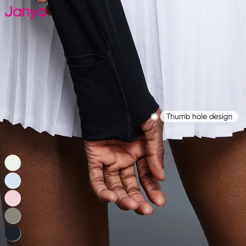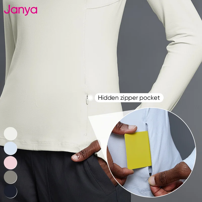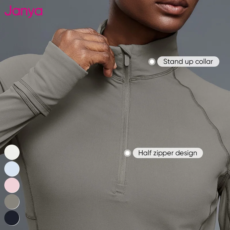 Janya Slim Fit Gym Sports Shirt Stand Collar Half Zipper Thumb Holes Long Sleeve Fitness Yoga Tops with Hidden Pocket for Women