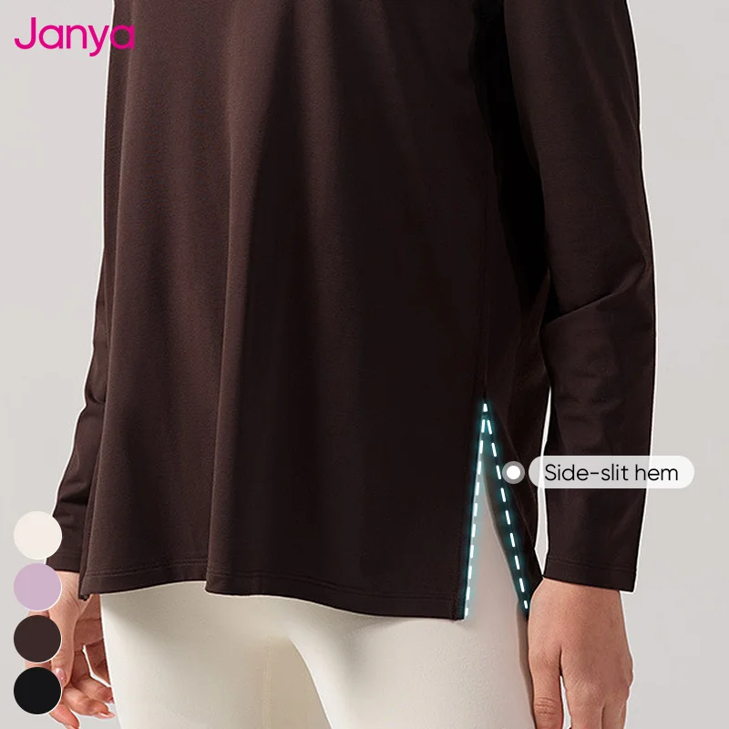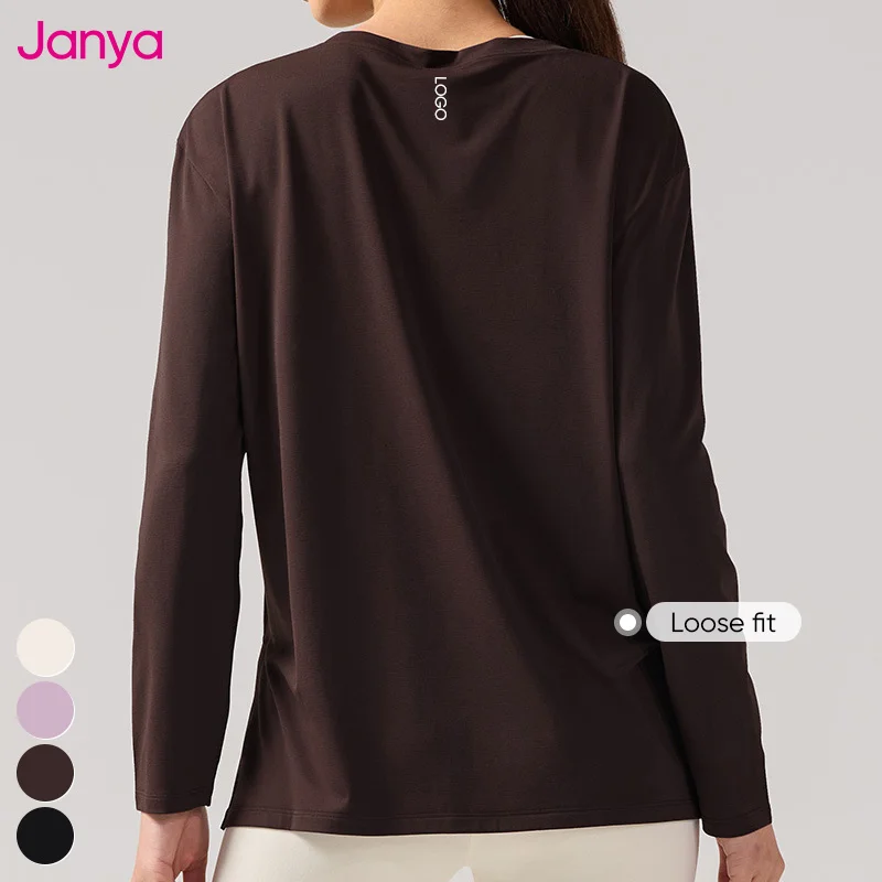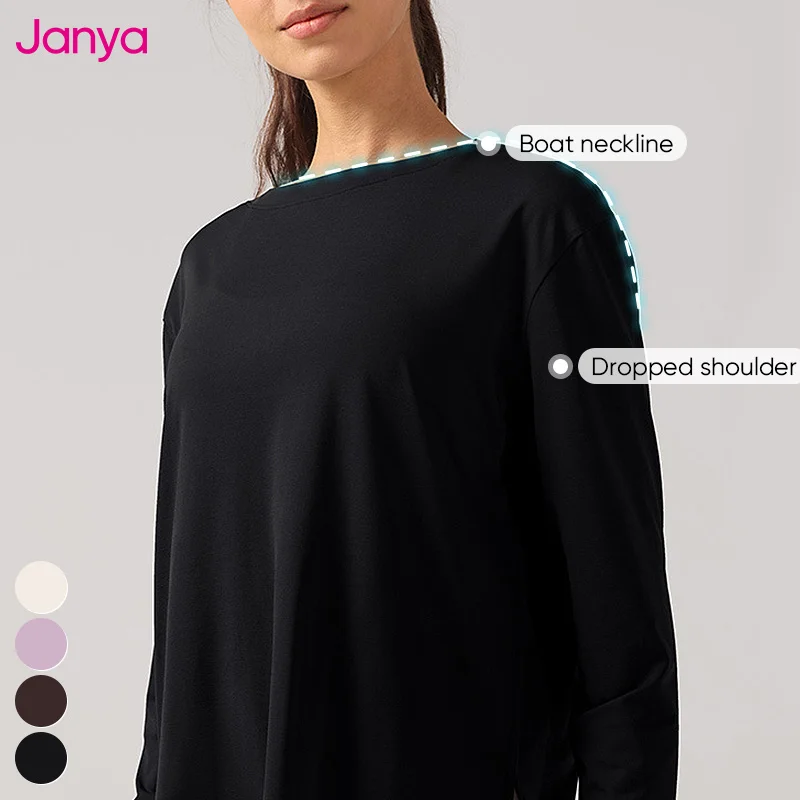 Janya 2026 Nude Feel Soft Elastic Breathable Sports Wear Boat Collar Long Sleeve Fitness Gym Clothing Loose Yoga Shirt for Women
