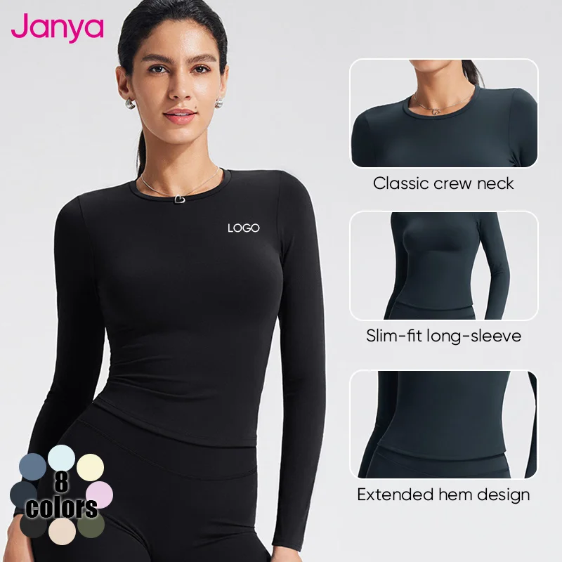 Janya Breathable Moisture Wicking Front Logo Pullover Athletic Wear Crew Neck Slim Fit Long-Sleeved Quick Dry Fitness Yoga Shirt