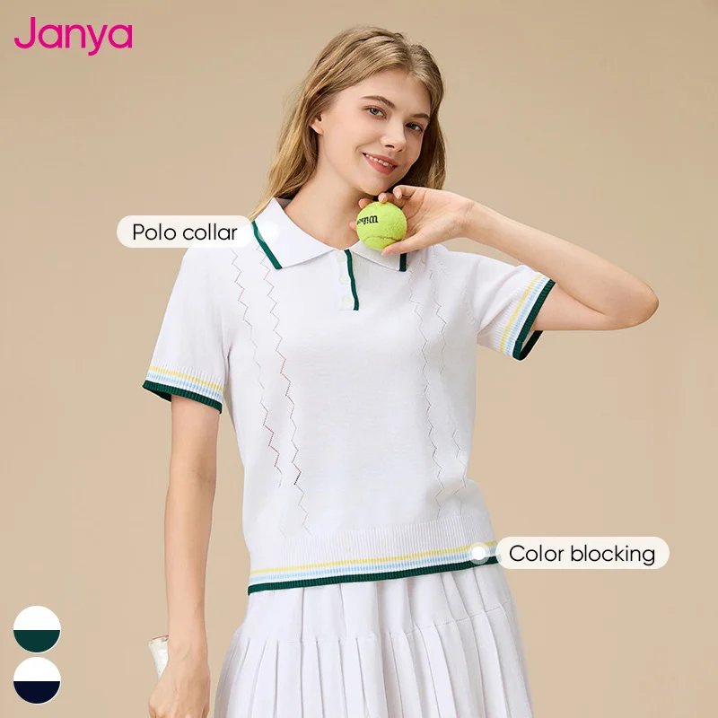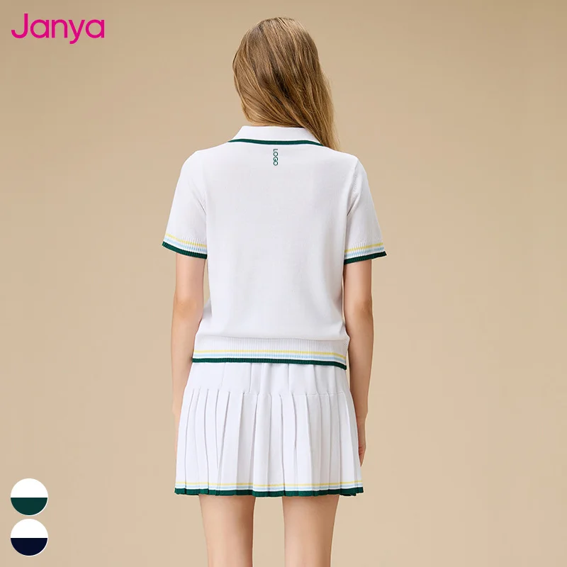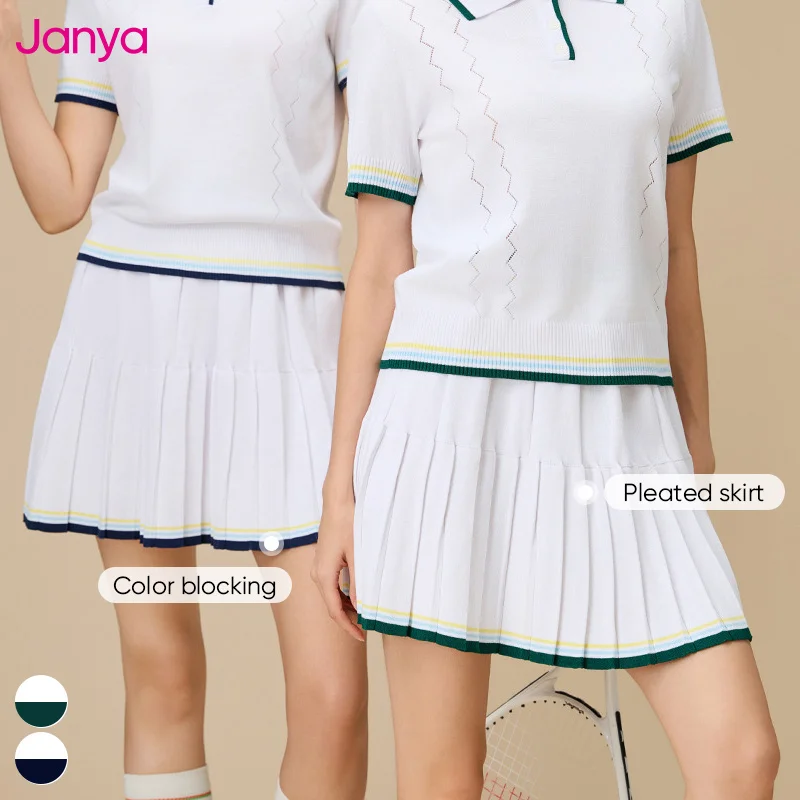 Janya Breathable Short Sleeve Polo Collar Golf Shirt Sets Mini Pleated Skirts Color Blocking Pickleball Tennis Wear 2-Piece Set