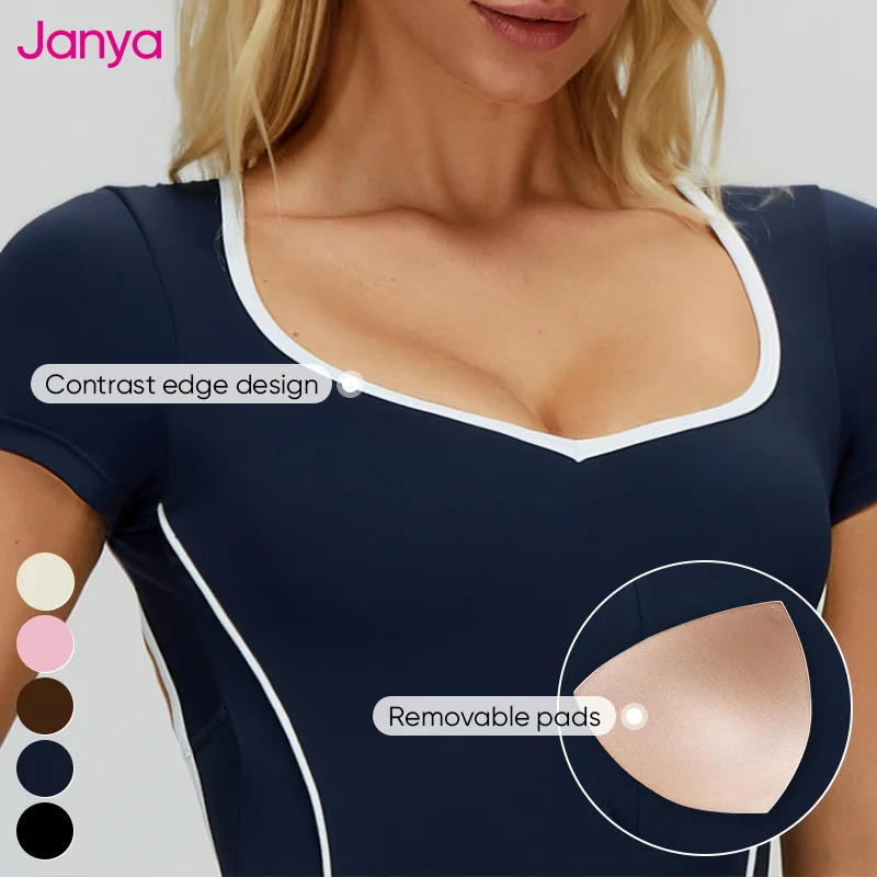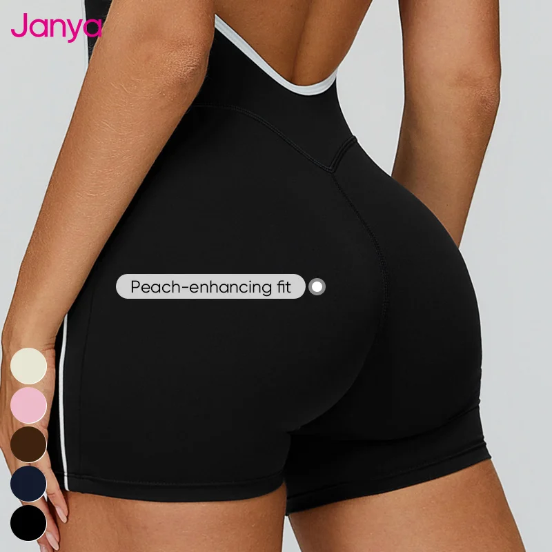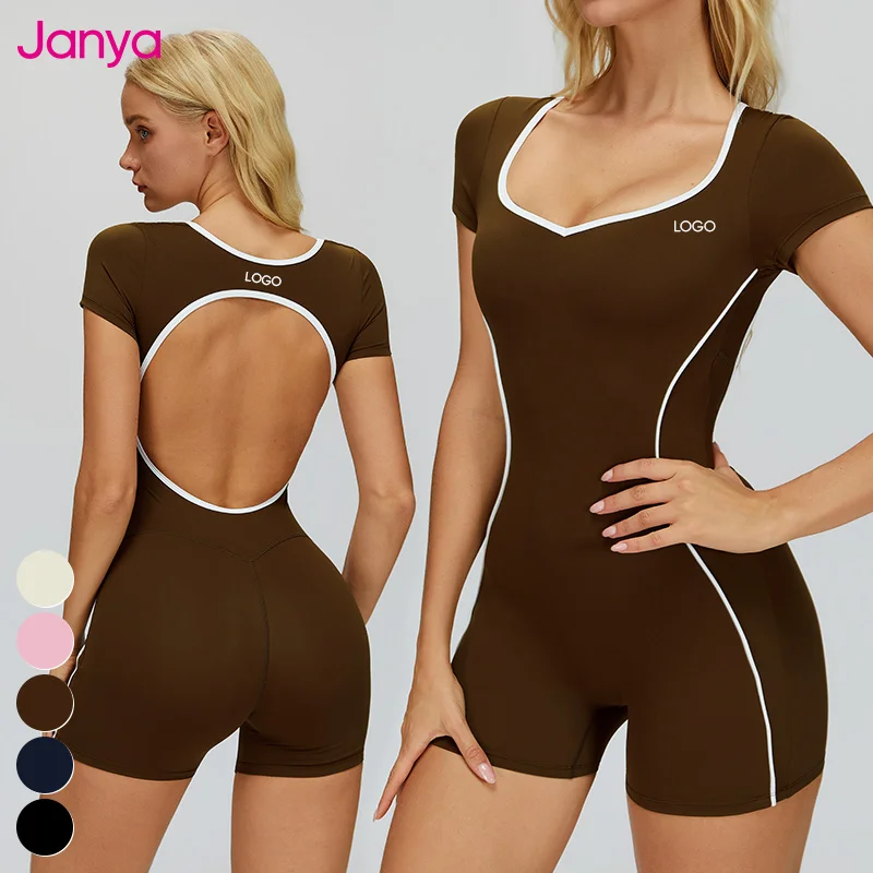 Janya Color Blocking Quick Dry Workout Wear Short Sleeve Backless Breathable Sports Bodysuit One Piece Fitness Yoga Jumpsuit