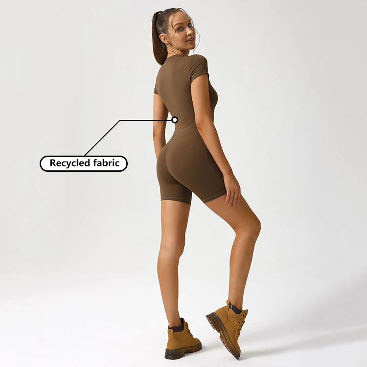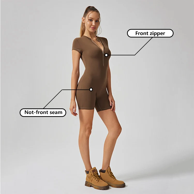 ODM OEM Women Shorts Sleeves One Piece Yoga Bodysuits Active Fitness Sport Wear Romper With Zipper Tight Slim Fit Workout Romper