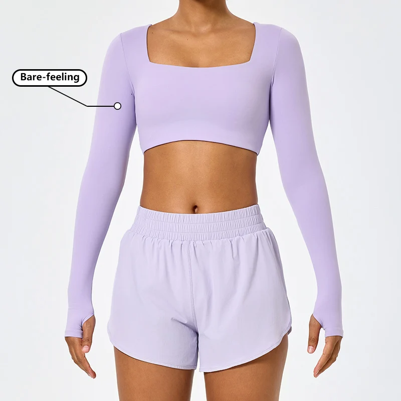 Square Neck Crop Top Bare-Feeling High-Elastic Thumb Hole Yoga Crop Tops for Women Slim Fit Long Sleeves Workout Cropped Shirts