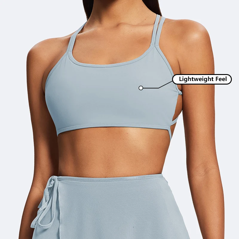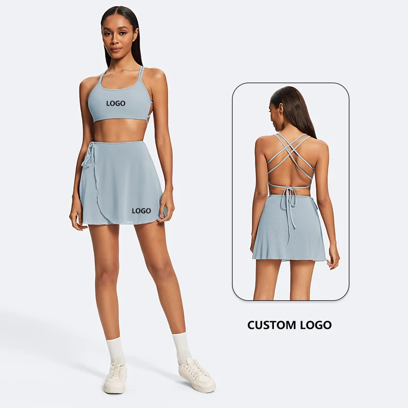Custom Logo Quick Dry Lightweight Two Piece Women's Backless Strap Bra and Detachable Mesh Petal Skirt Leisure Workout Clothes