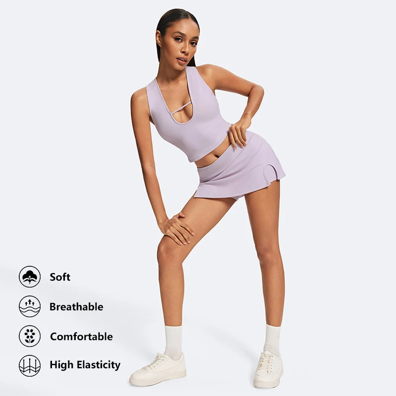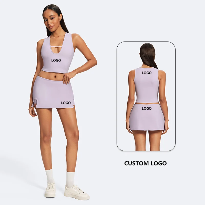 Wholesale Custom Summer Breathable Compression Slim Fitting V Low Neck Top and Low Waist Double Slit Hip-Hugging Mini Skirt Sets