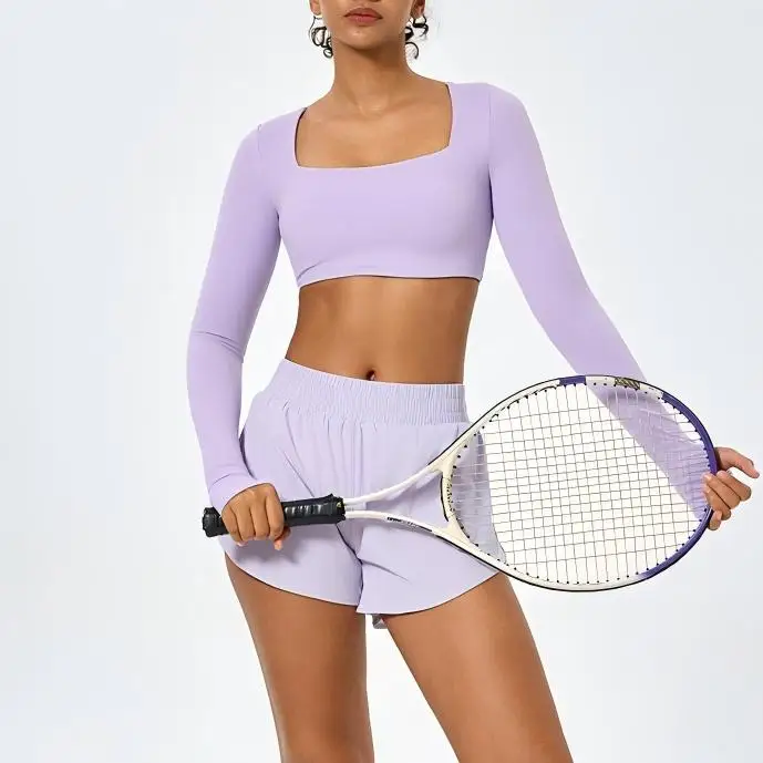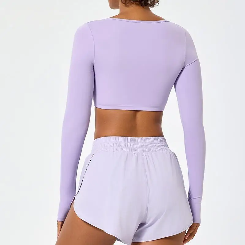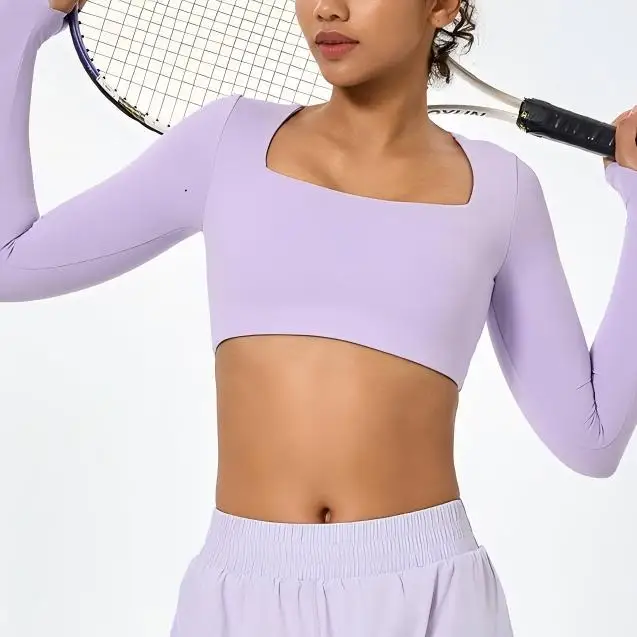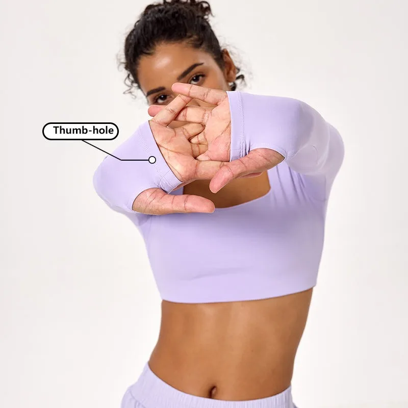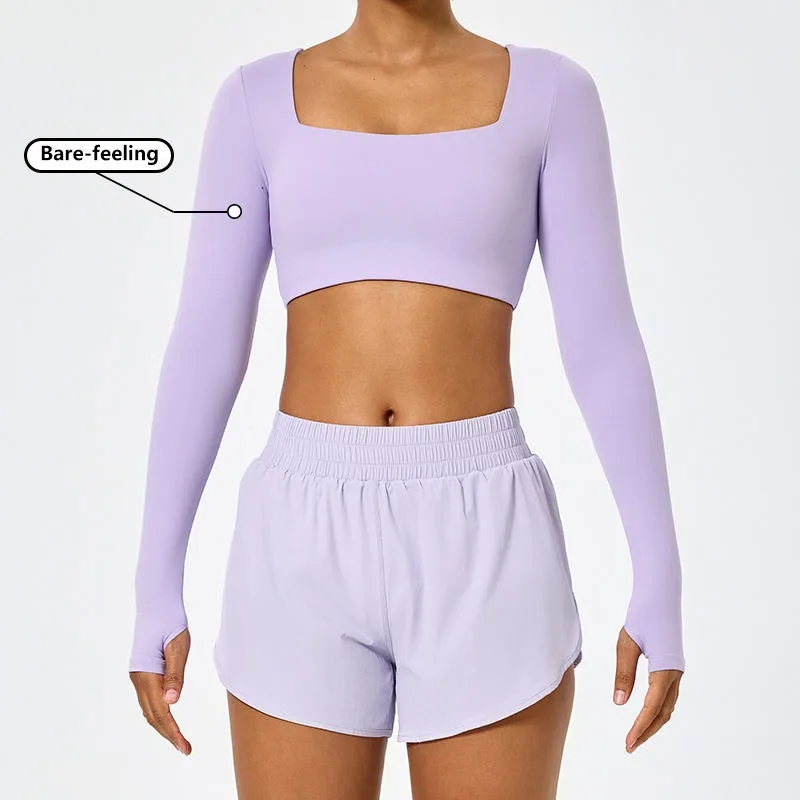 Custom Square Neck Crop Top Bare-Feeling High-Elastic Thumb Hole Yoga Crop Tops for Women Slim Fit Long Sleeves Workout Yoga Top