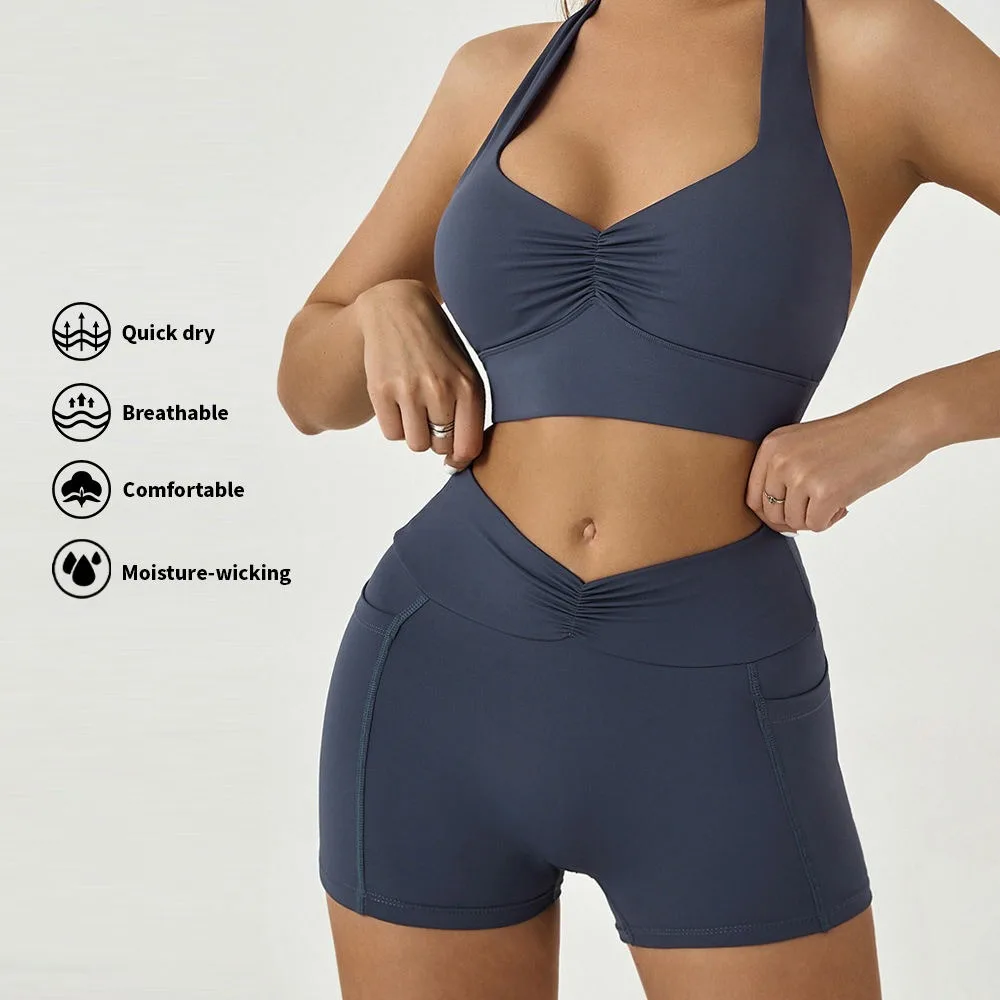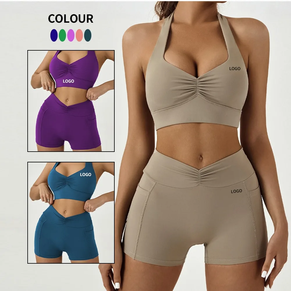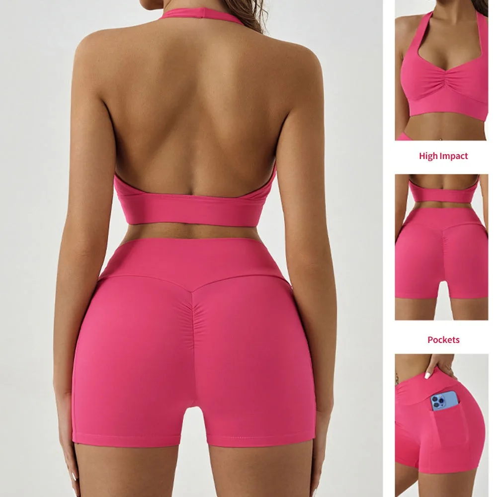 Custom Solid Plus Size Yoga Sets Quick Dry Sweat-Wicking Sports Bra Shorts 2-Piece Workout Clothes Breathable Fitness High Front