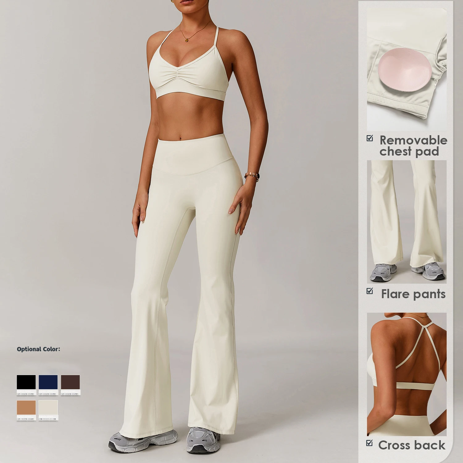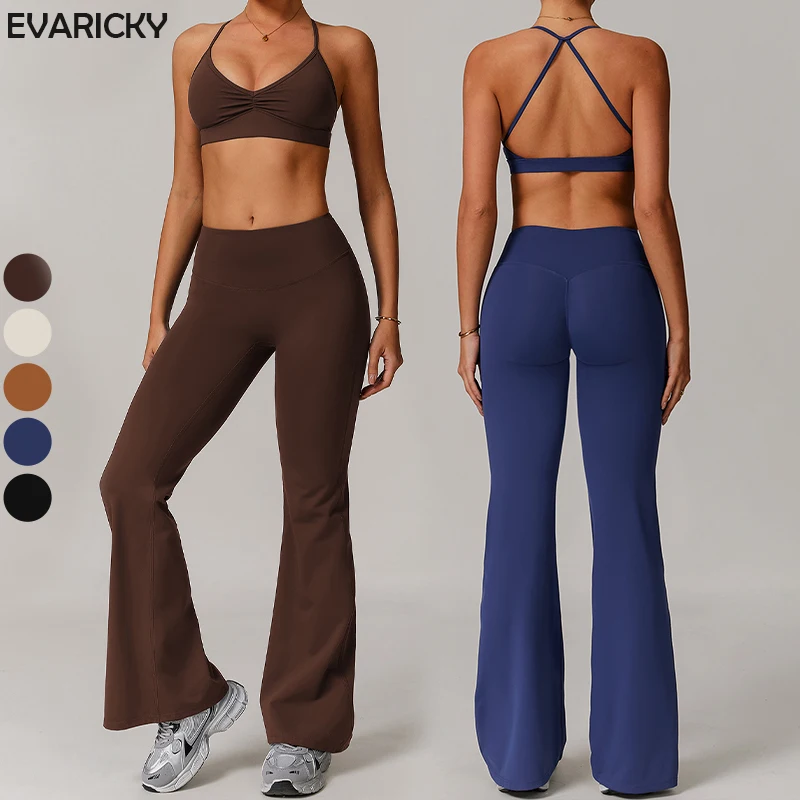 Women's High Quality 2-Piece Yoga Suit Wholesale Backless Cross Front Wrinkled Sports Bra Breathable Flared Pants Solid Pattern