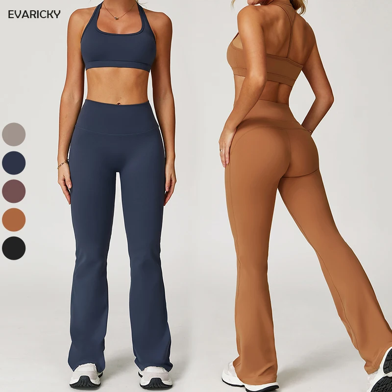 Custom Logo Women's Sets 2 Piece Yoga Set Active Naked Feeling Halter Bra High Waist Tummy Control Gym Leggings Flare Pants Set