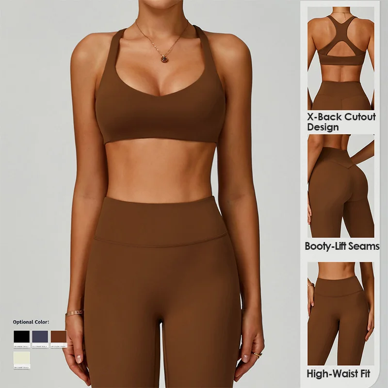 Wholesale 75% Recycled Nylon 25% Spandex Hollow Cross Back Sports Bra Activewear Fitness High Waist Leggings 2 Piece Yoga Set