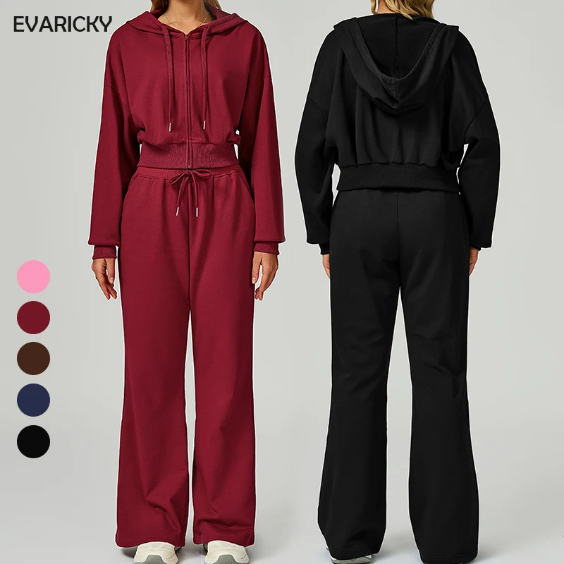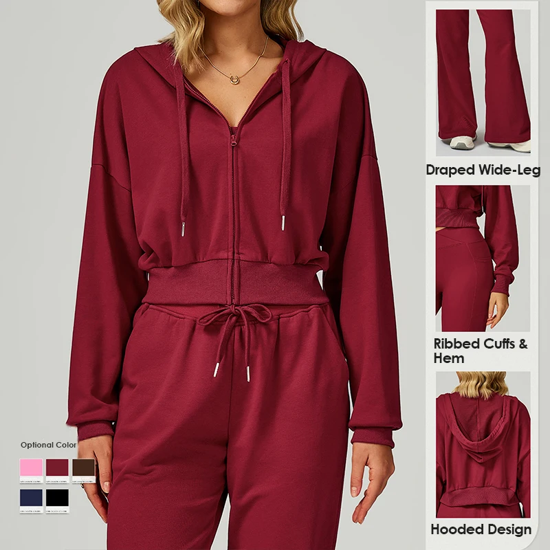 Custom Outdoor Casual Activewear Side Pocket Design Womens Jogger Pants Sweatpants and Zip Hoodie Set with Cropped Hoodie