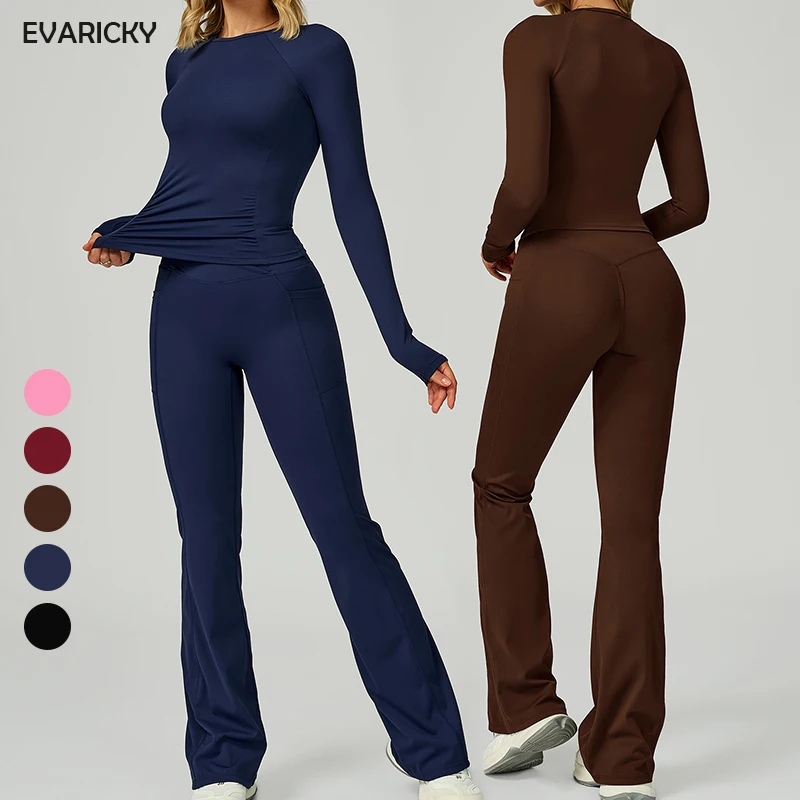 Hot Sale Running Yoga Clothing Fitness Yoga Wear 2 Piece Sports Set Long Sleeved Round Neck T Shirts Flare Leggings Workout Sets