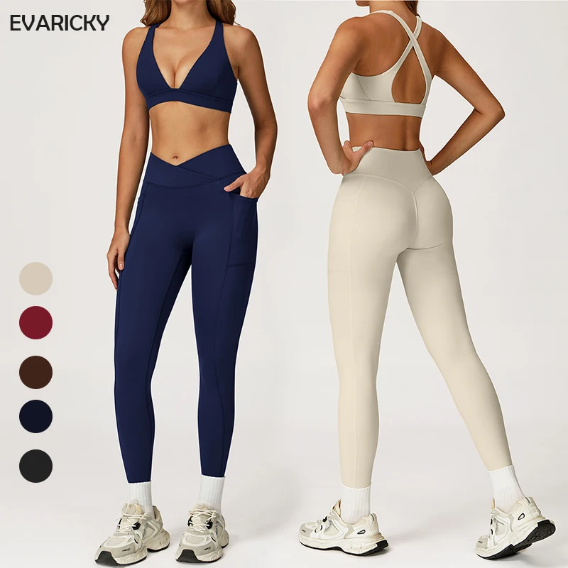 Women's Solid 2-Piece High Waist Leggings & Deep V Sports Bra Set Quick Dry Four-Way Stretch Breathable Active Wear