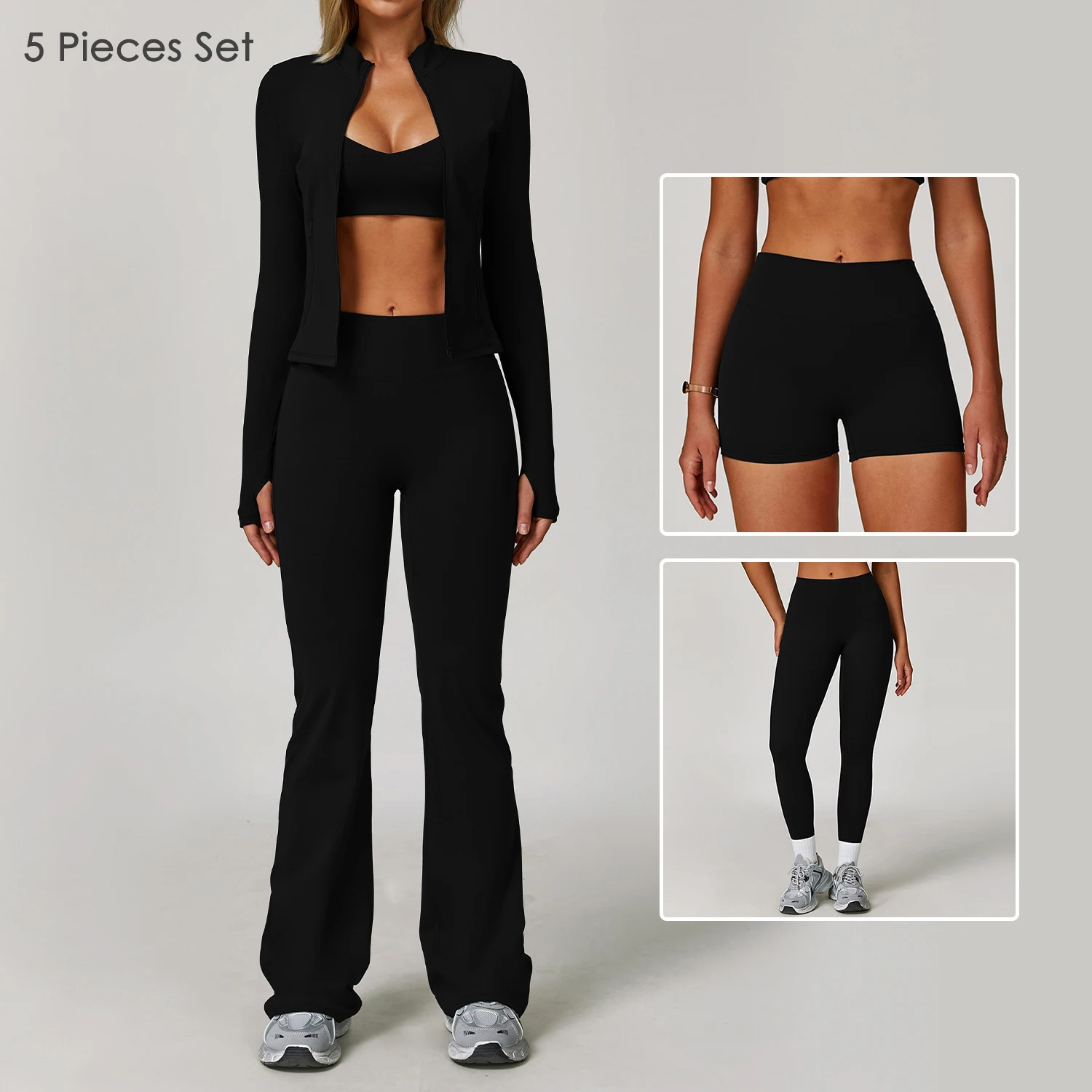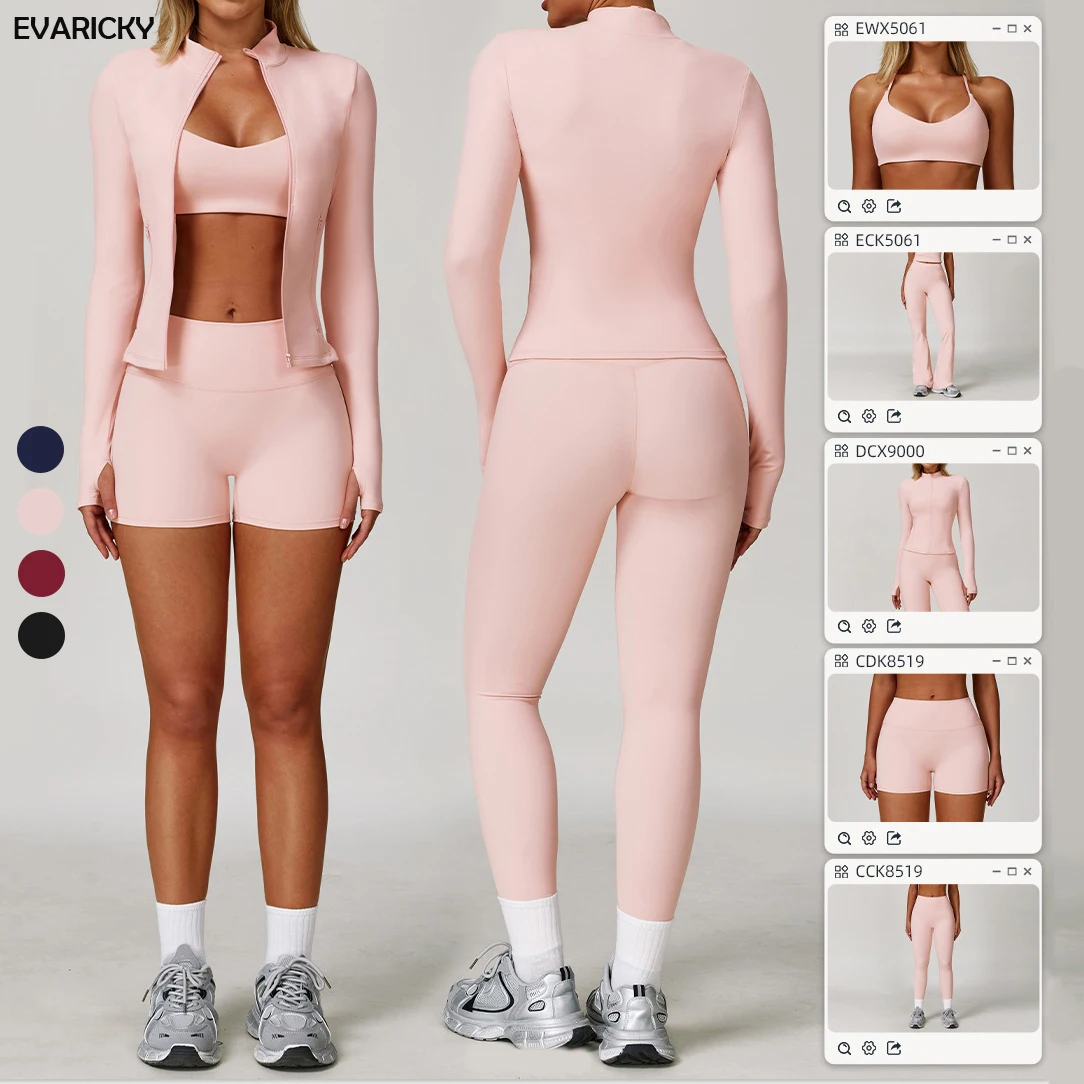 Evaricky Women 5 Piece Adjustable Shoulder Strap Sports Bra Top Thumb Hole Zipper Jacket Biker Shorts Leggings Gym Fitness Set