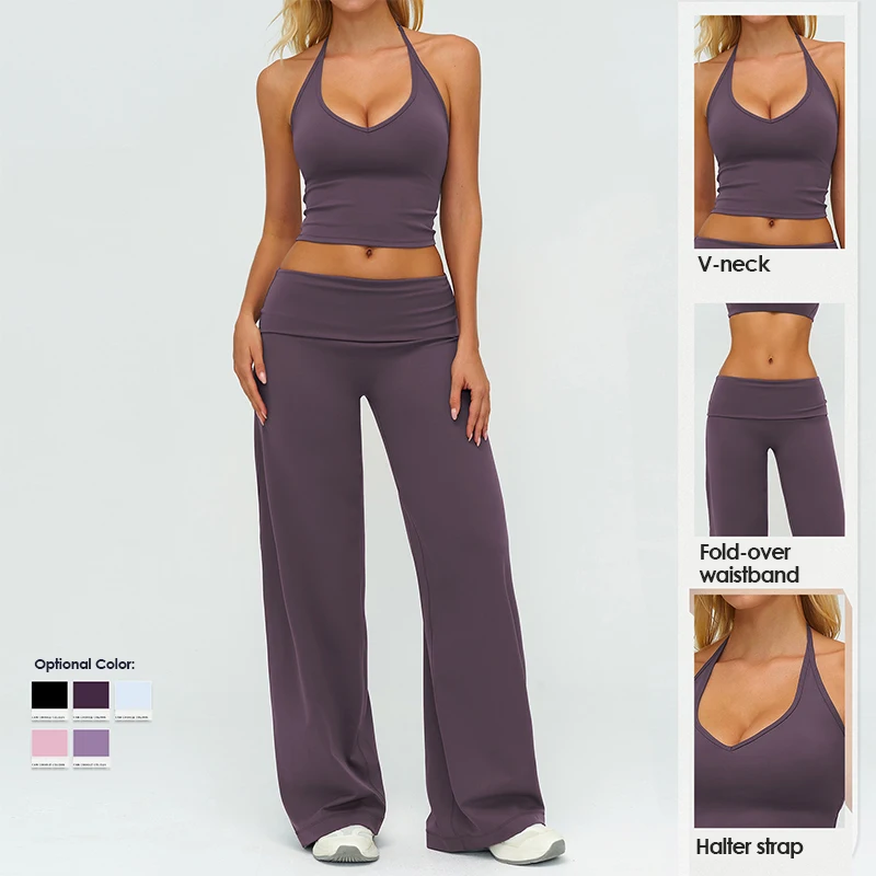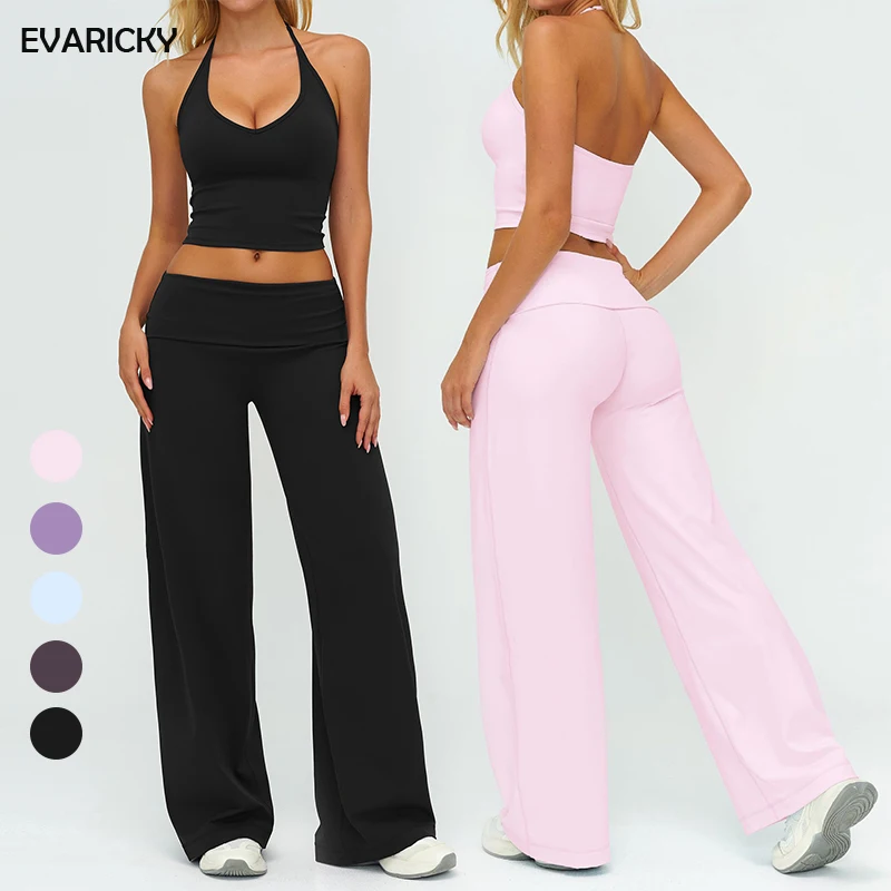 Evaricky Women Casual Running Wide-Leg Yoga Pants Gym Workout Fitness Clothes Halter V Neck Yoga Tank Top Suit Activewear Set