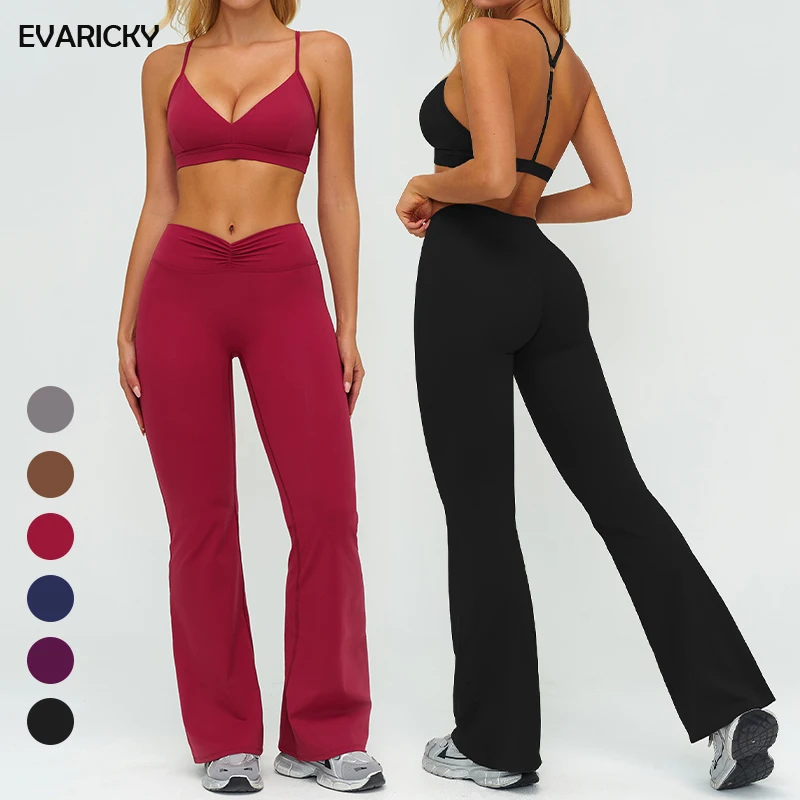 Evaricky Women's High Waist V Cut Flare Pants High Impact Workout Sports Bra Solid Breathable Running 2 Piece Gym Yoga Set