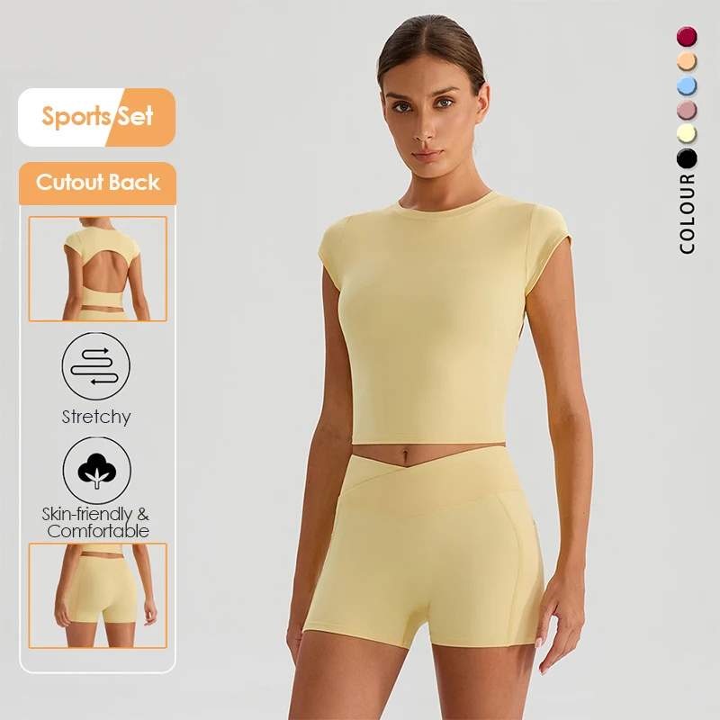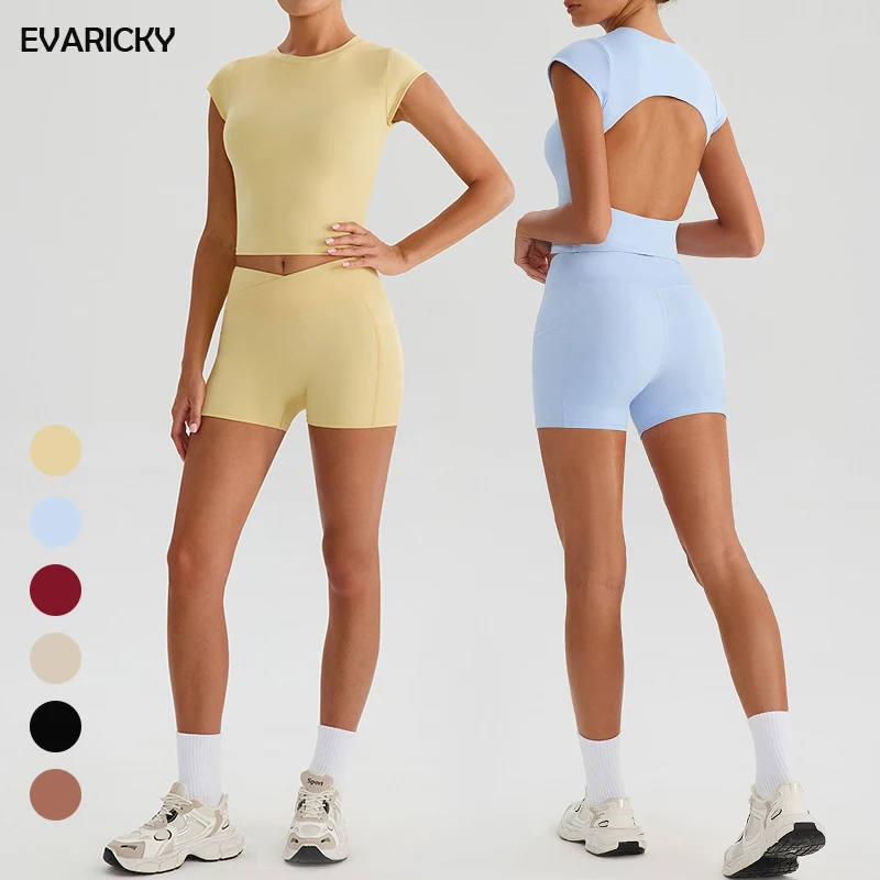 Evaricky Hot Selling High Quality Fashion Gym Wear Hollow-out Backless Gym Shirt Elastic V Waist Yoga Shorts Fitness Workout Set