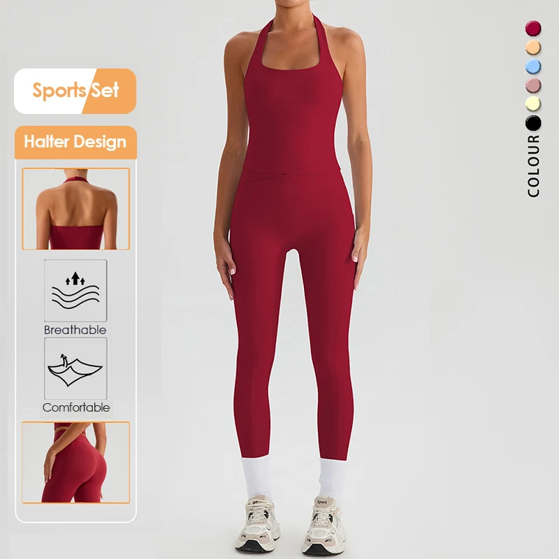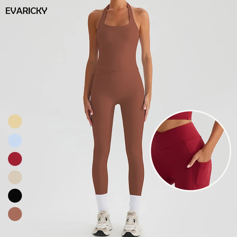 Evaricky Comfortable Sleeveless Women Halter Backless Padded Tank Tops Running Apparel Yoga Wear Butt Lift Gym Legging Sets