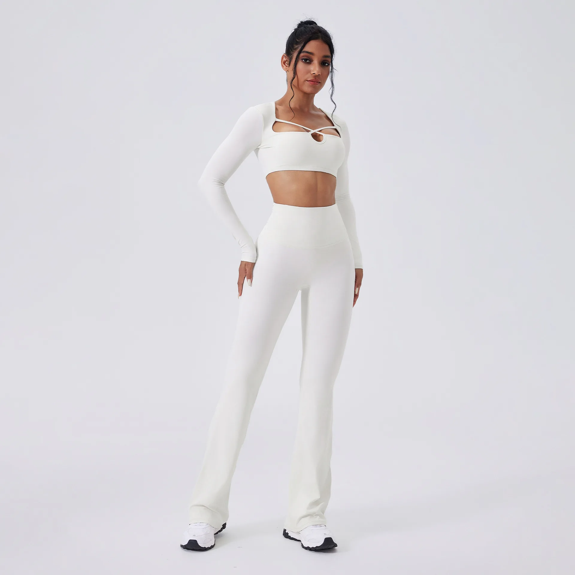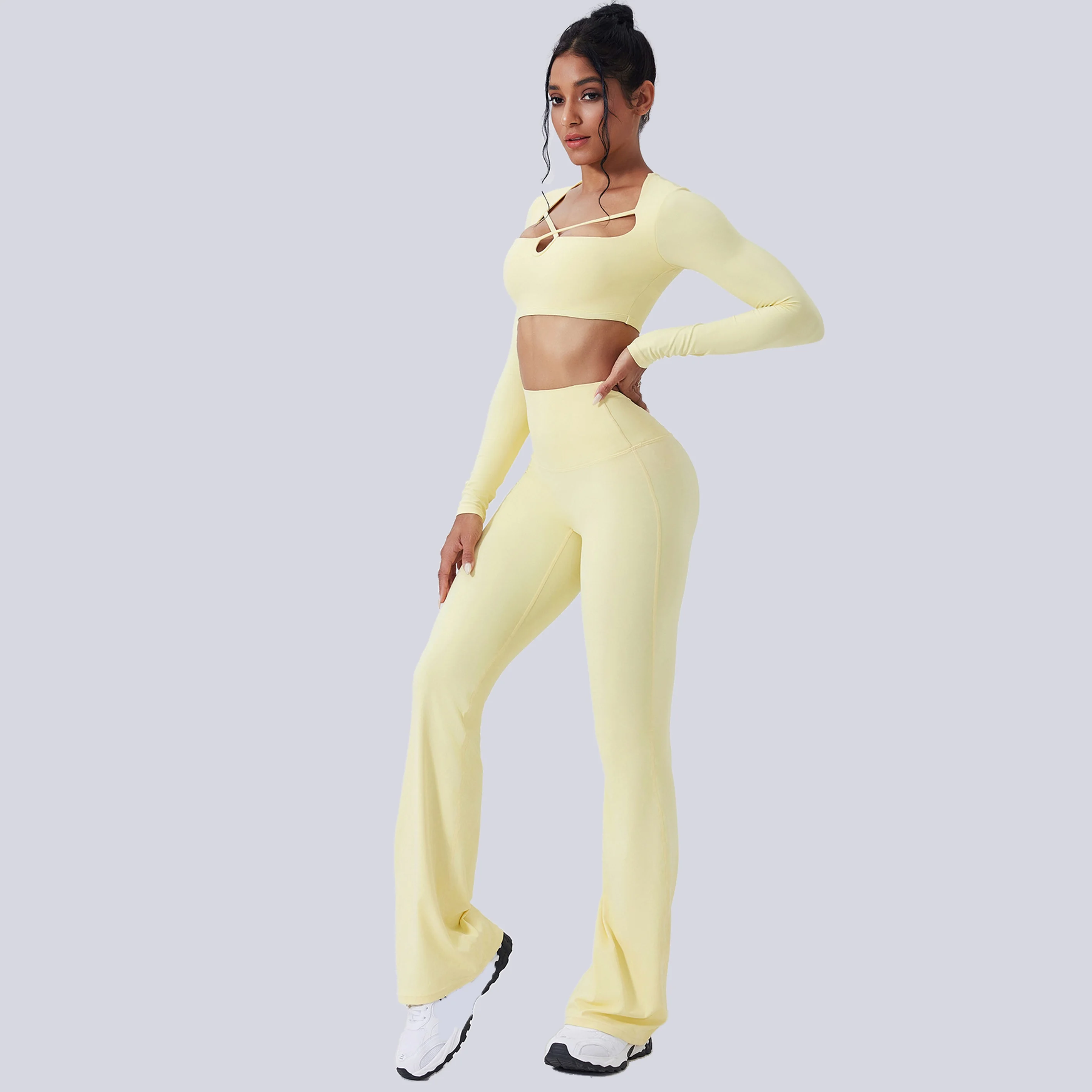 Color Block Brushed Yoga Set Hollow Slim Fit Yoga Fitness Outfit Running High Waist Flared Pants Long Sleeve Set