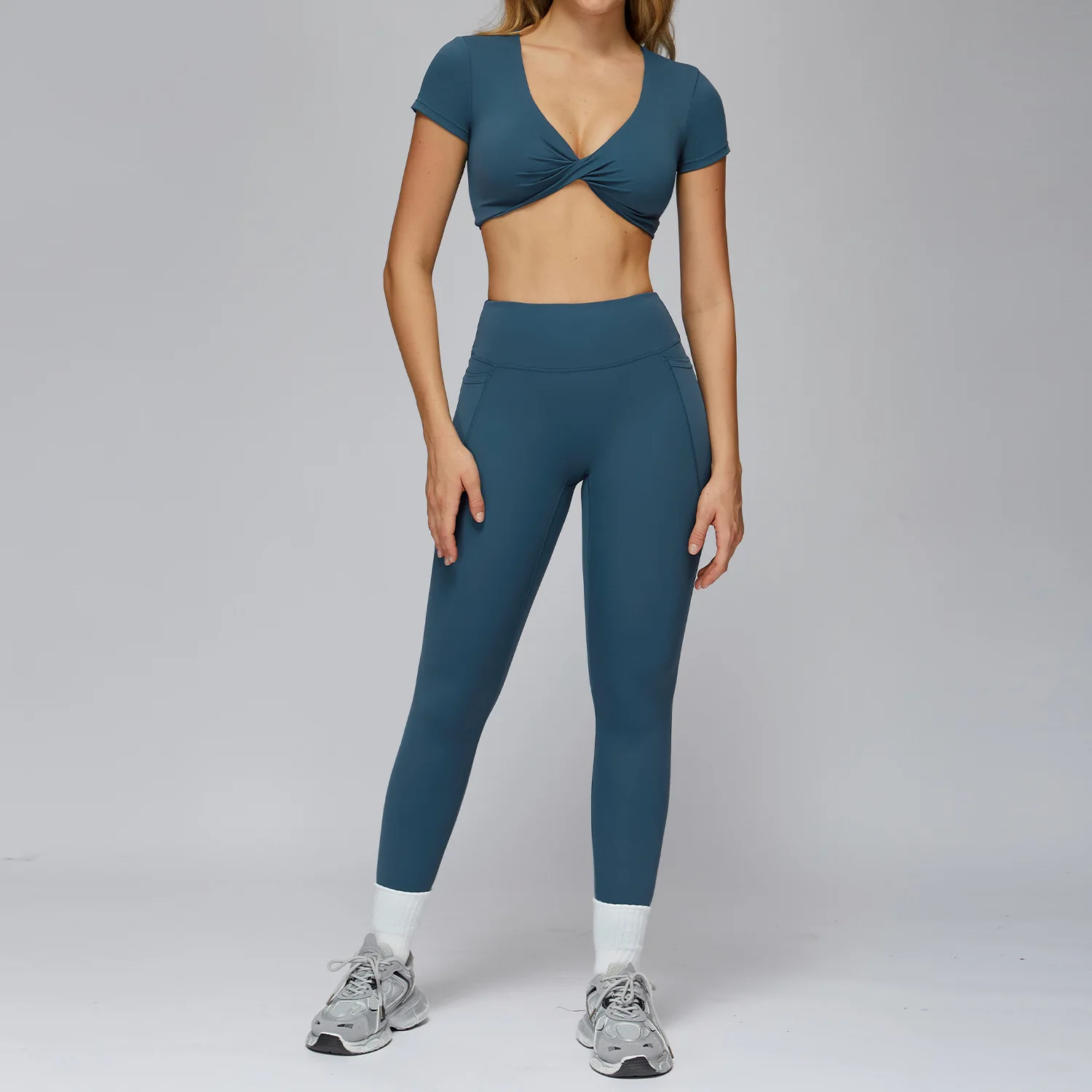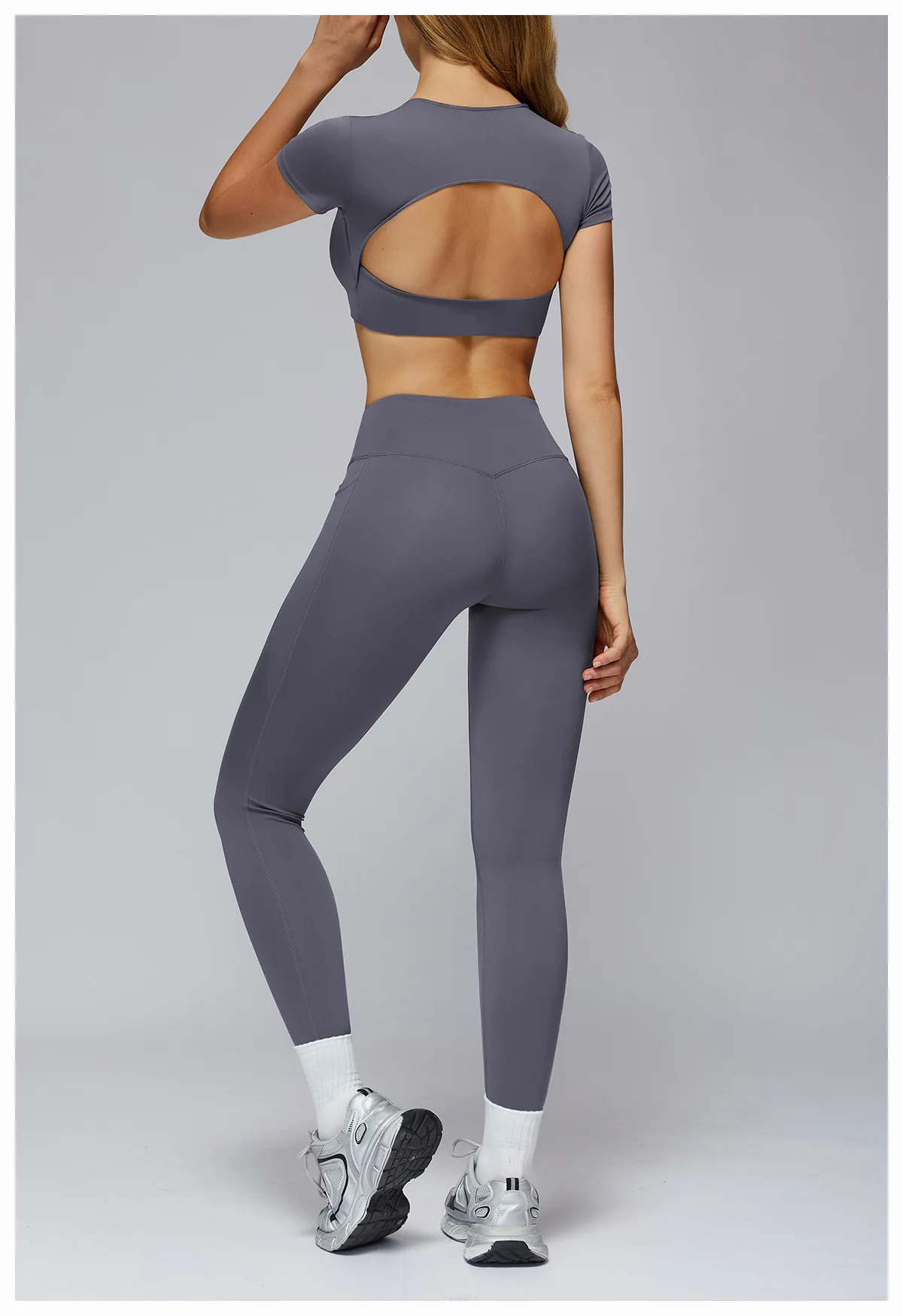 High Quality OEM Sample Tight Sports Top High Waist Quick Dry Butt Lifting Yoga Pants 2pcs Gym Fitness Wear Hollow Out Crop Top