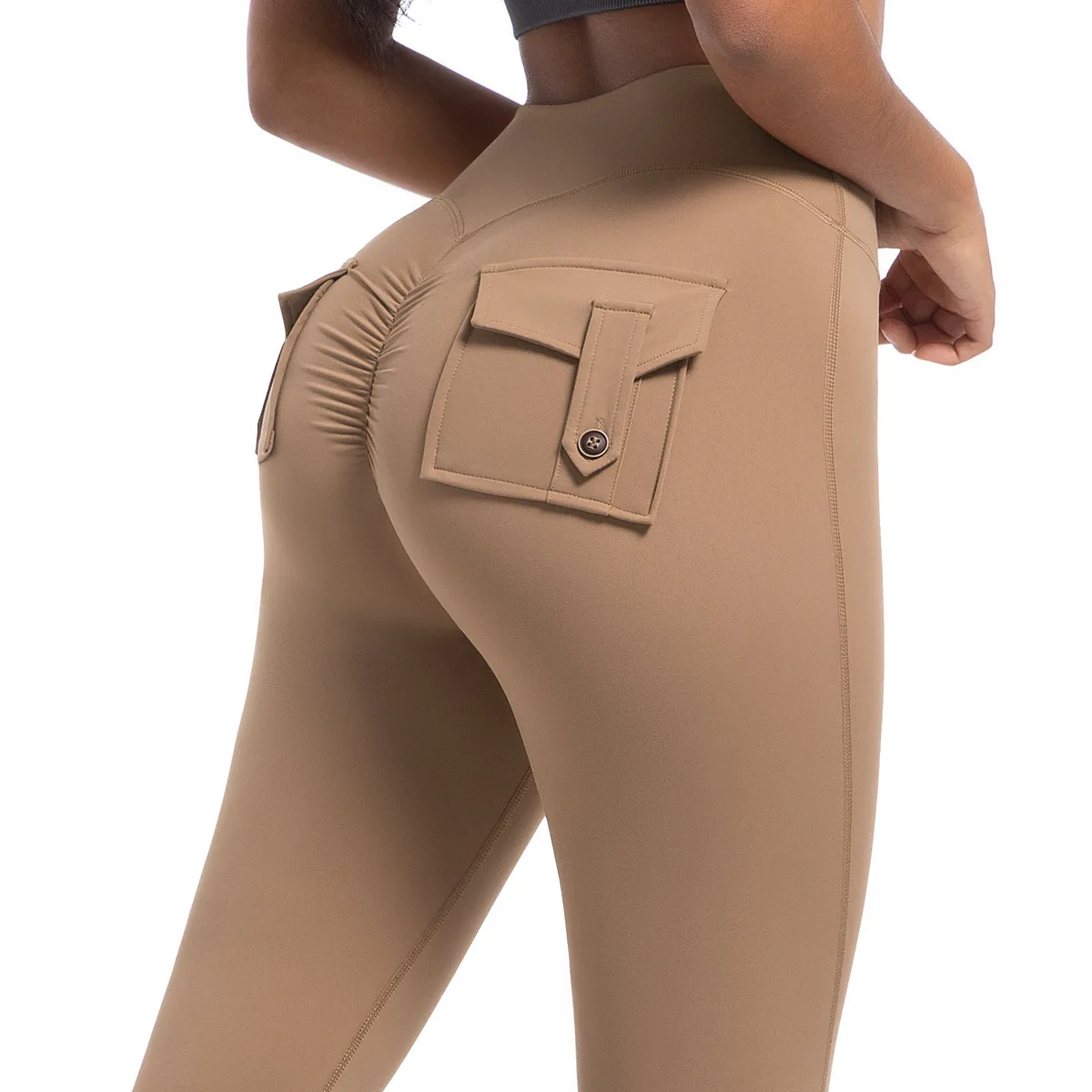 Women's High Waist Fitness Pants With Pocket Yoga Pants Peach Workout Skinny Button Pocket Fitness Leggings