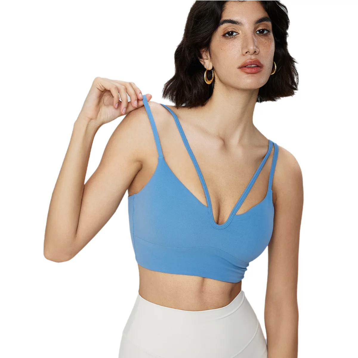 Sexy Deep V Workout Sports Vest Shockproof Running Halter Top with Removable Cups & Cross Strap Breathable Feature