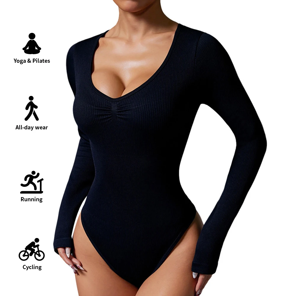 Seamless Yoga Butt Jumpsuit Chest Ruffle Wide Neck Bodysuit Triangle Shapesuit Black Yoga Suit