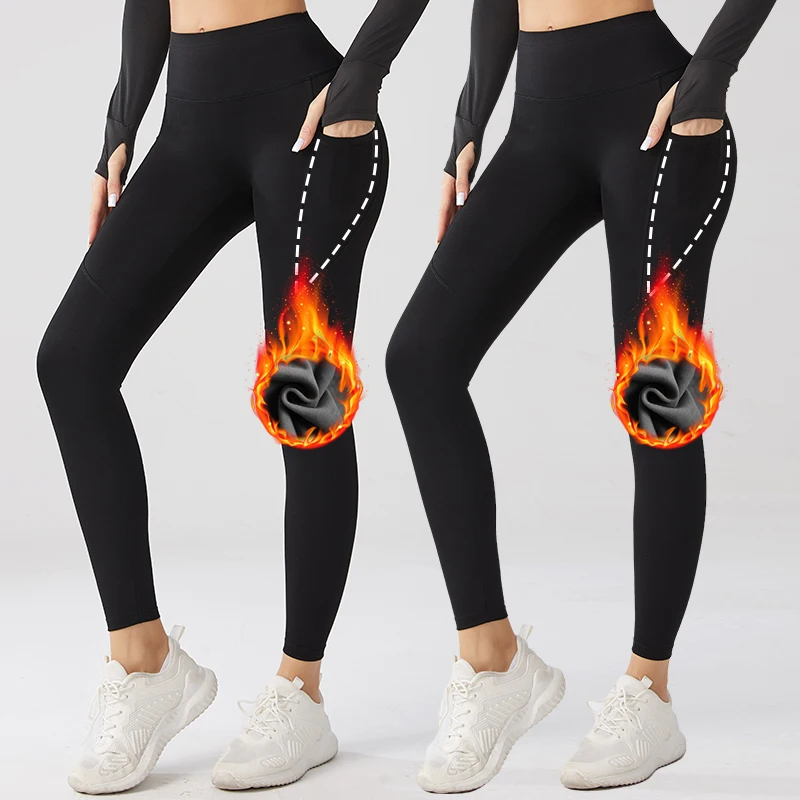 Women High Waist Thick Thermal Leggings With Pocket Polyester Warm Winter Fleece Lined Yoga Leggings