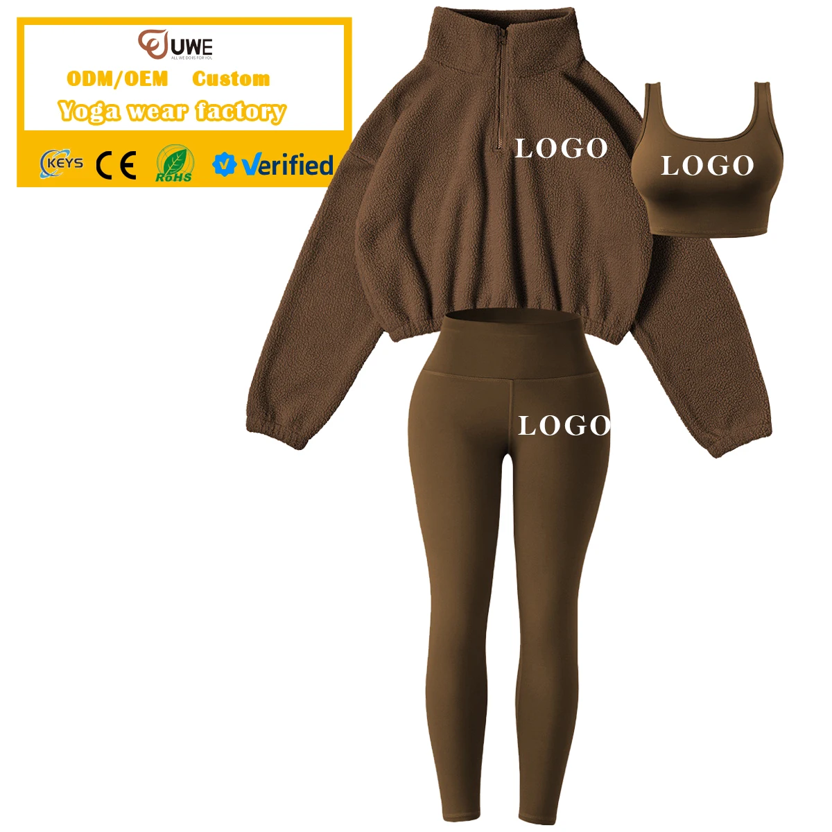 Custom Logo Winter New Sportswear Leggings and Bra Set Ladies Long Sleeve Hoodies Tracksuits 3pcs Yoga Set