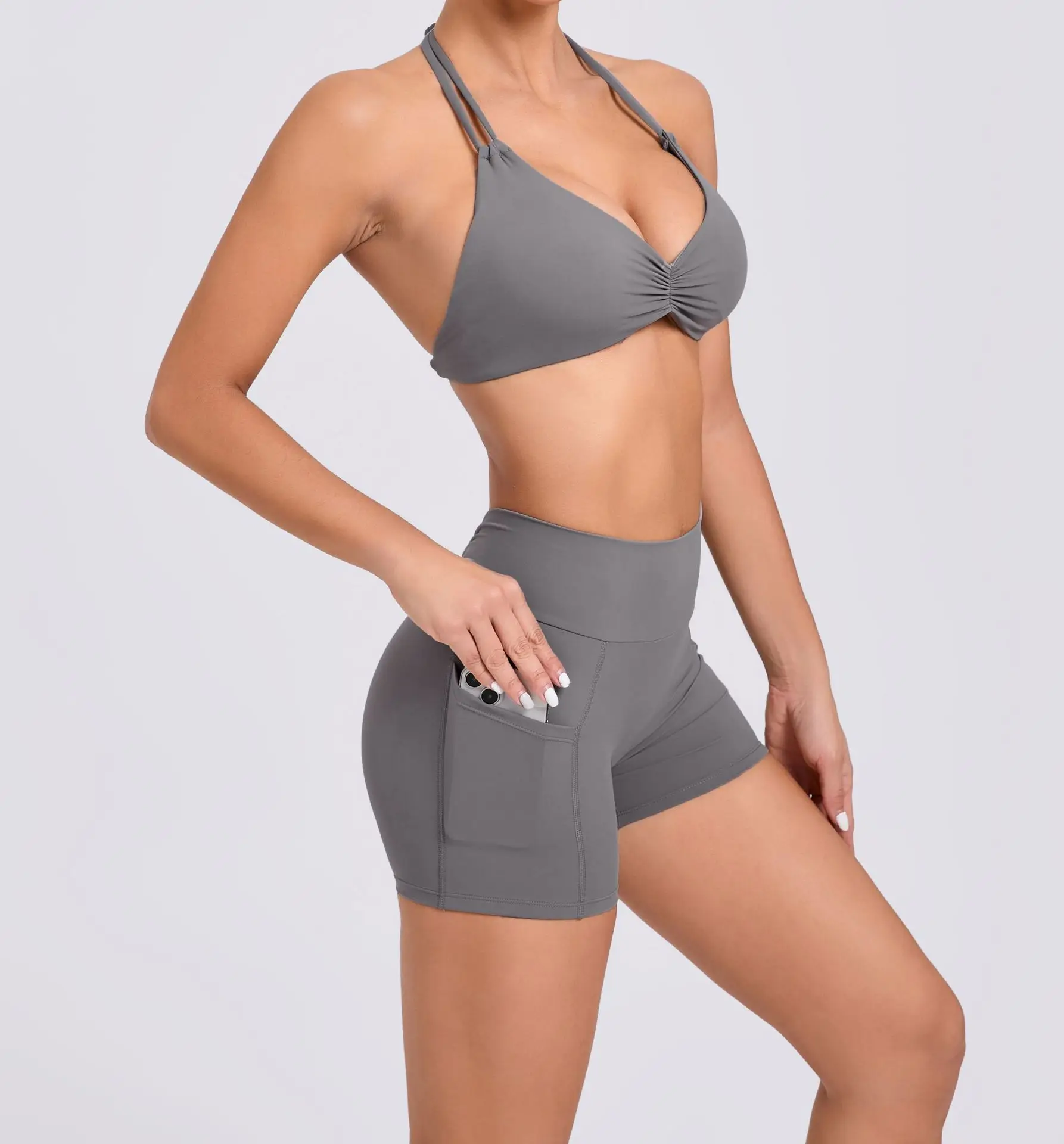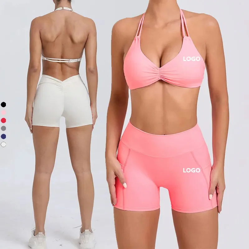 Wholesale Fashion Halter Top Sport Bra Adjustable Strap Gym Scrunch Butt Shorts Yoga Sets