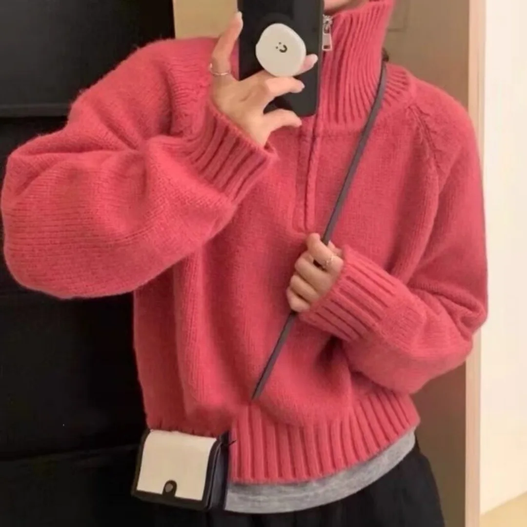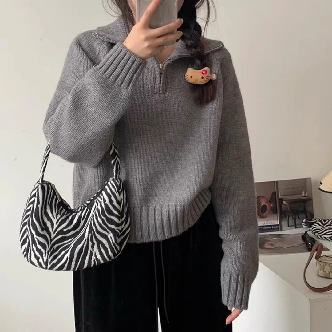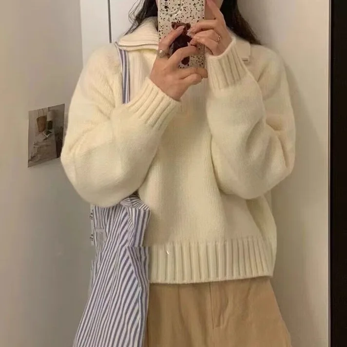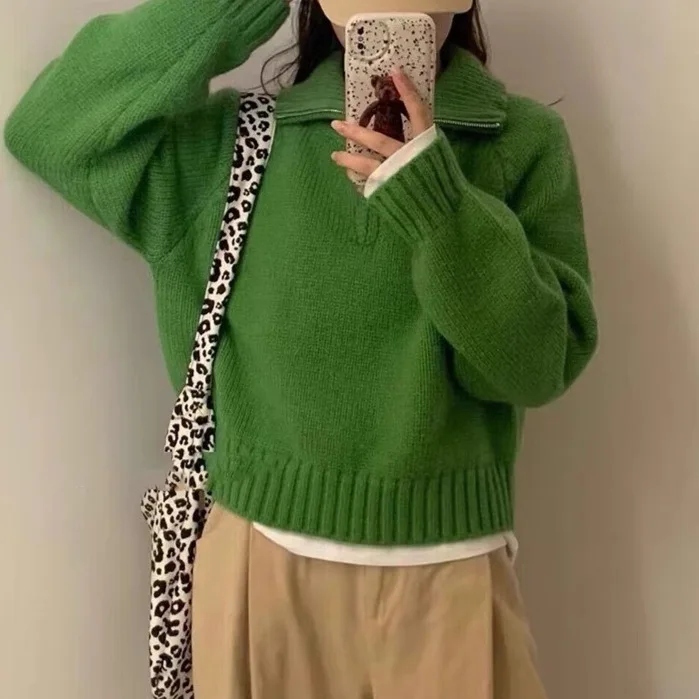 Zipper Turn Down Collar Casual Knitted Long Sleeve Sweater Women's Fashion Solid Female Pullover Top