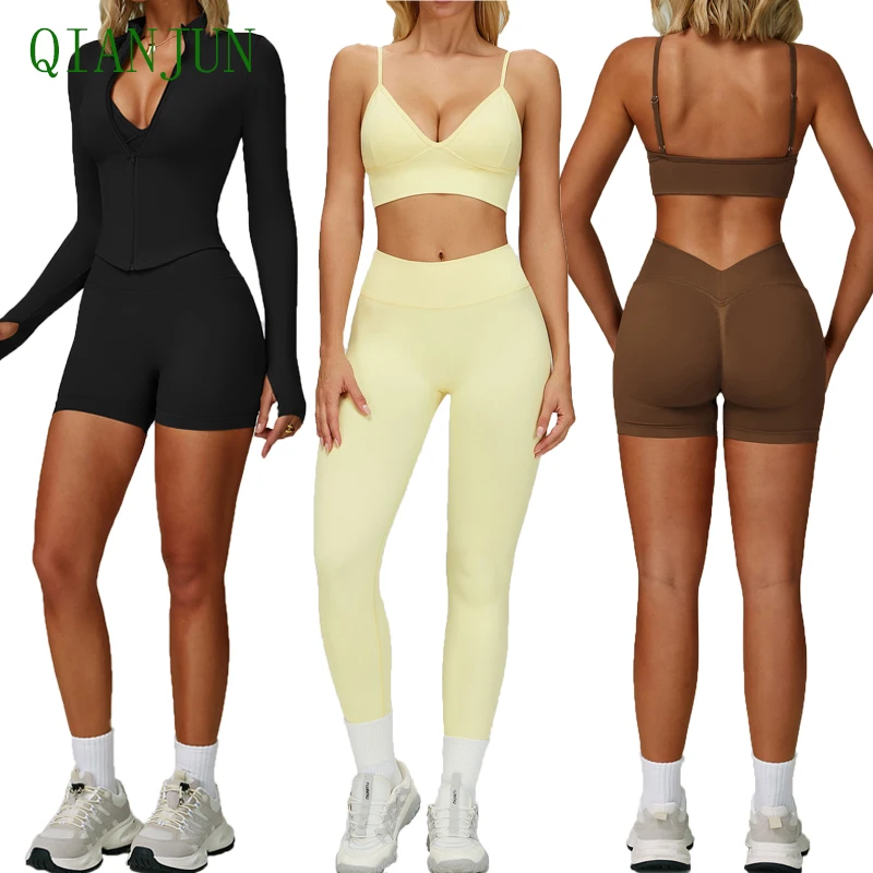 Wholesale Women Slim Fitting Workout Sets High-Waist Stretchy V-Neck Yoga Shorts Bra Set Pilates Activewear Sports Set