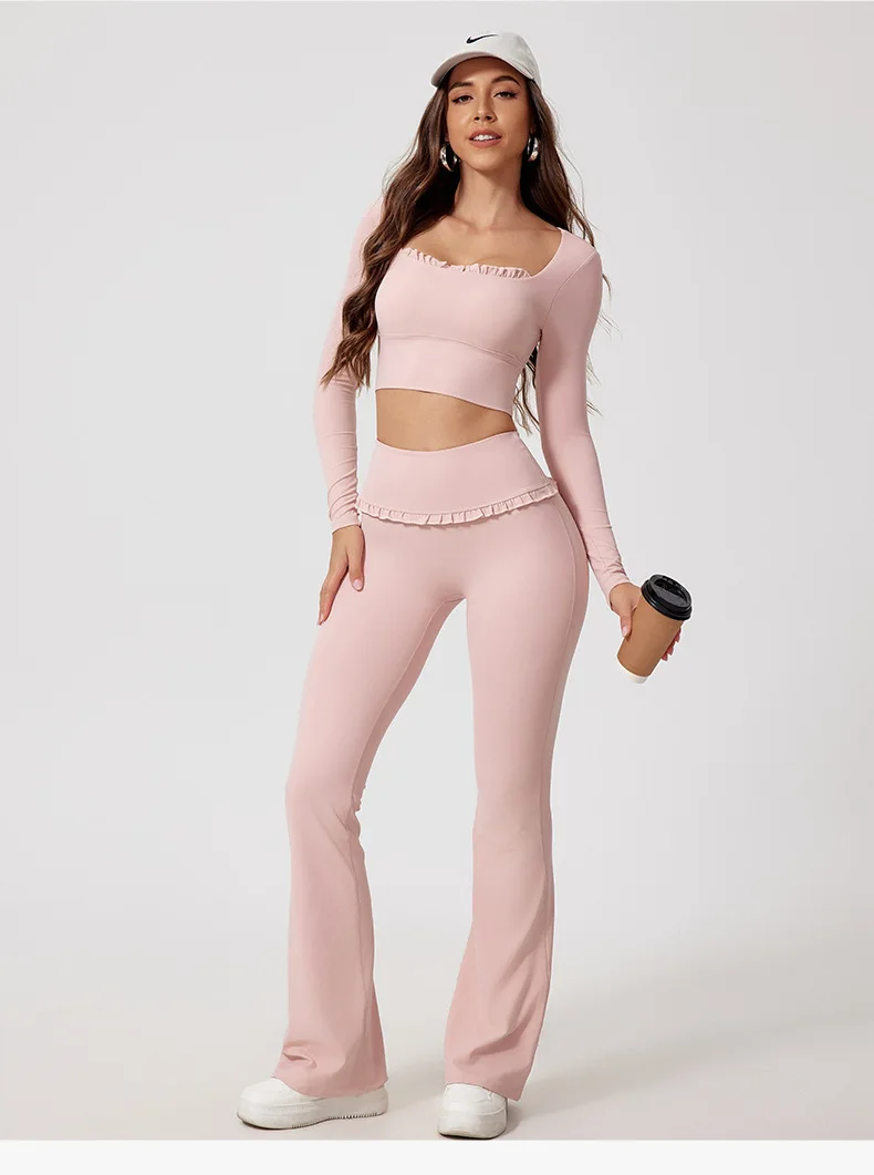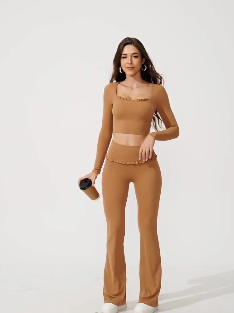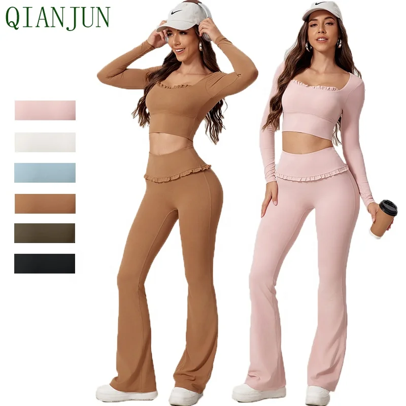 Hot Sell Gym Fitness Wear 2 Piece Yoga Set Workout Casual Long Sleeve Clothing Flared Pants for Women Sportswear