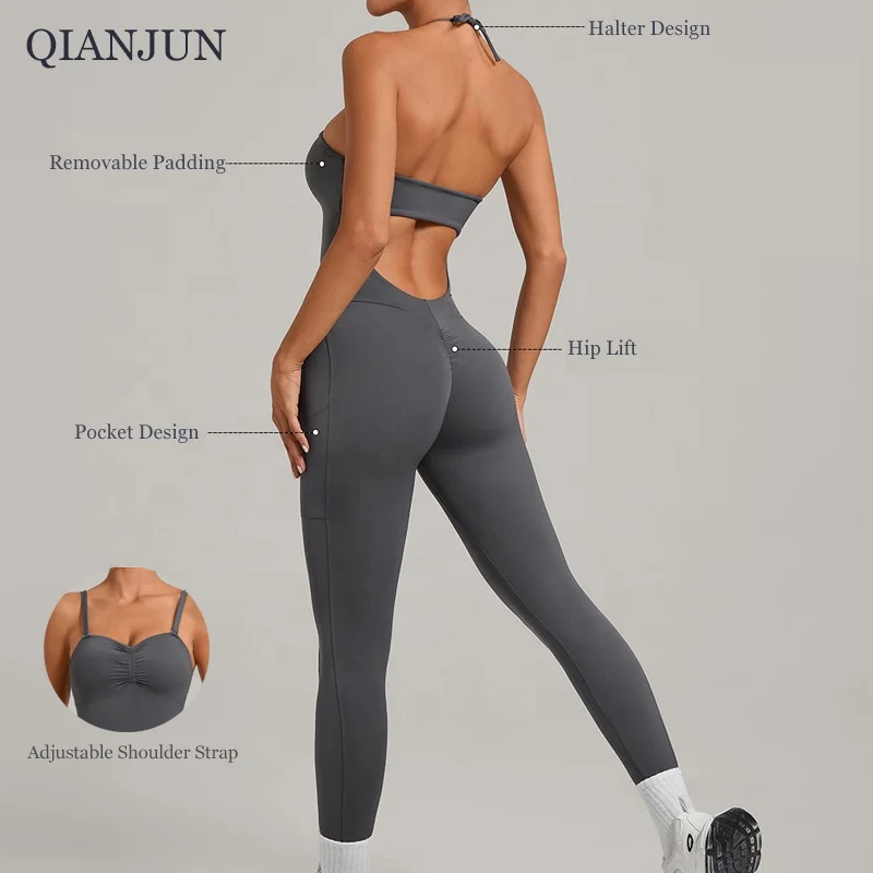New Women's Slim Fit Exercise Yoga Jumpsuit Active Wear Breathable Bodysuit on Side Pocket Deign Gym Fitness Workout Jumpsuit