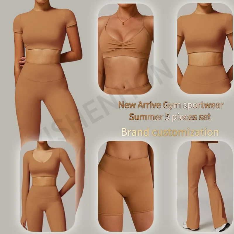 YISHENHON 2026 Summer 5-pieces Quick Dry Yoga Sets for Womens Tight High Waist Running Fitness Sports Suits Women Activewear