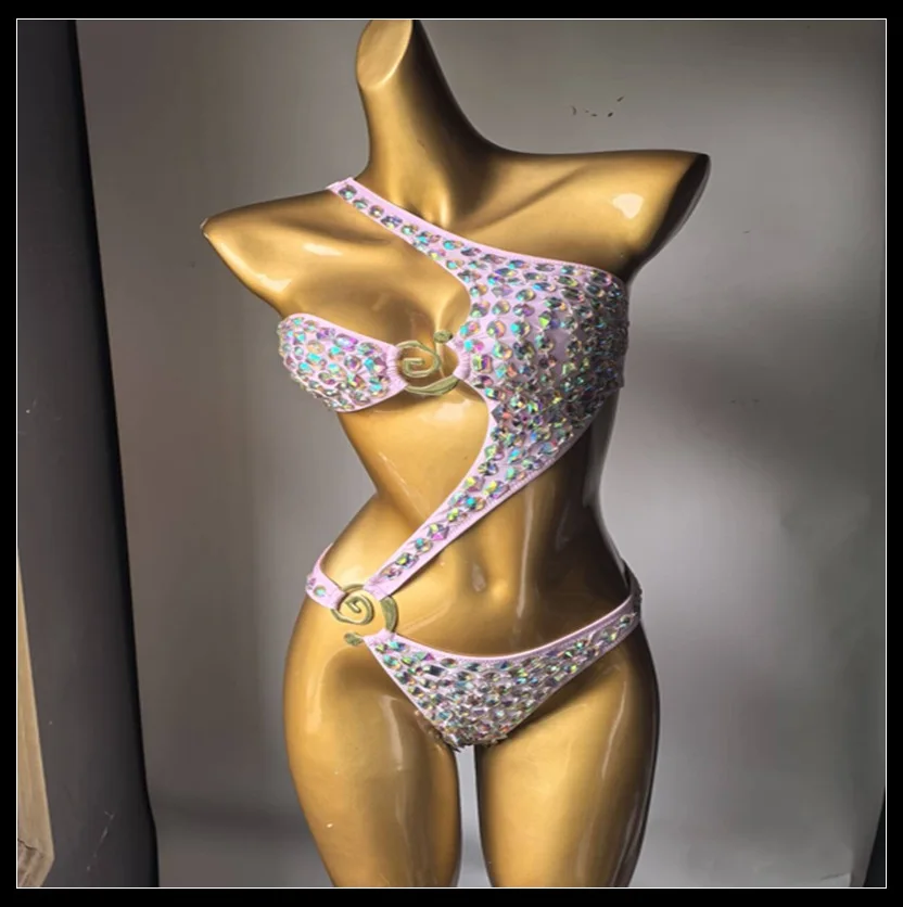 Crystal Stone 2-Piece Beachwear Set Halter Neckline Bikini with Solid Pattern Thong Bottoms and Rhinestone Biquini