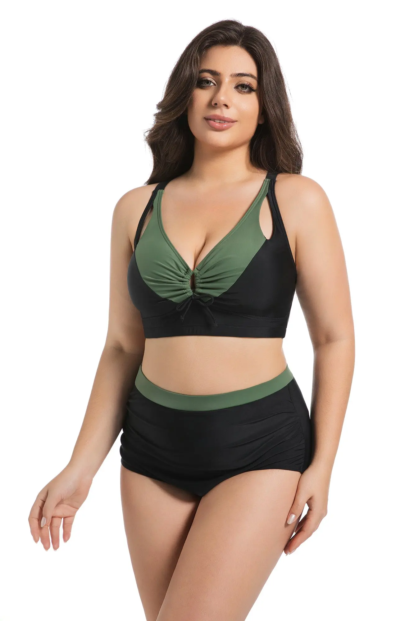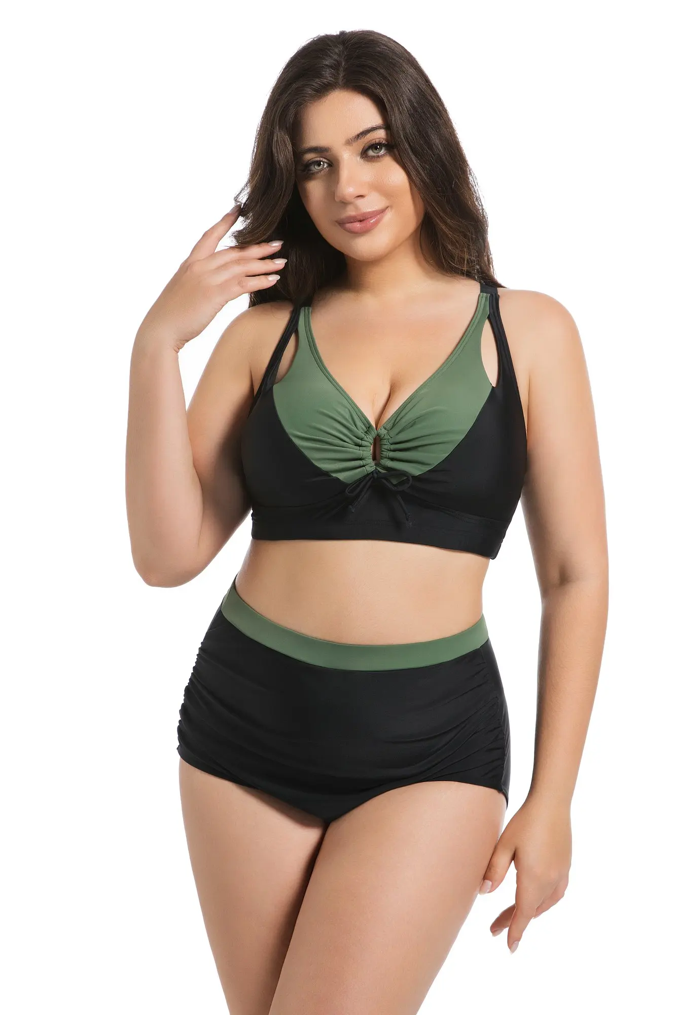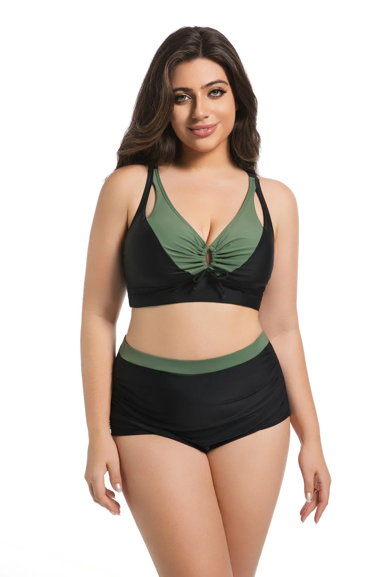 Women's 2-Piece Swimsuit V-Neck Bikini Set with High Waisted Bottom Push-up Bra Front Logo Plus Size Tummy Control