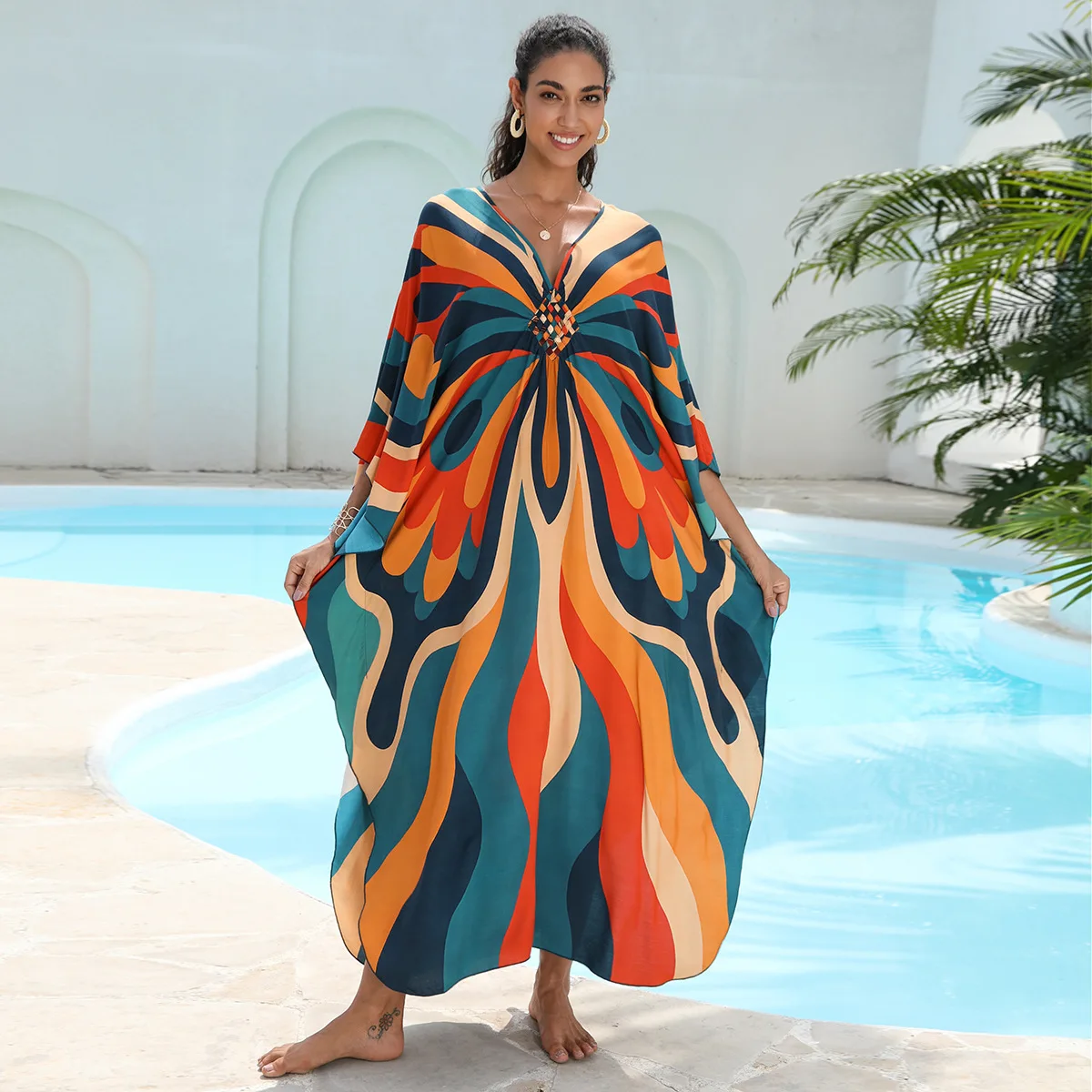 Beach Cover-up Rayon Digital Printing Vacation Robe Dress Beach Caftan Dress